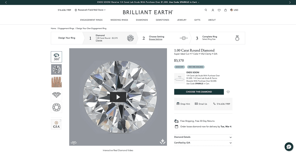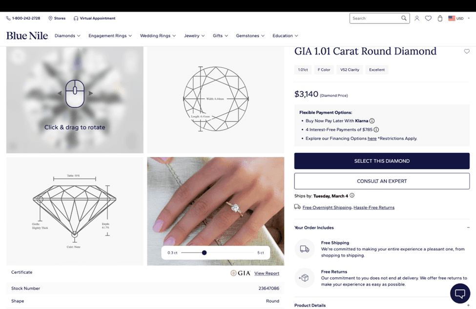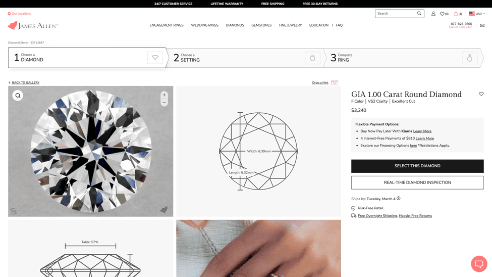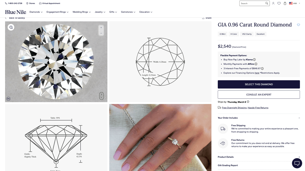 The Blue Nile 360° HD diamond imaging system magnifies every diamond 40x and allows a buyer to view top, bottom and sides. This is a significant leap beyond the industry norm of 10x top only magnification. This technology not only enhances the buyer’s confidence by allowing a detailed inspection of the diamond’s facets, but it also reduces the risk of misrepresentation, a common concern in online purchases. We like that Blue Nile shows actual diamonds when you search their website and not just lists with stock or still images because it makes it so easy to compare different diamonds. In our test we were able to compare six certified diamonds simultaneously on an iPhone.