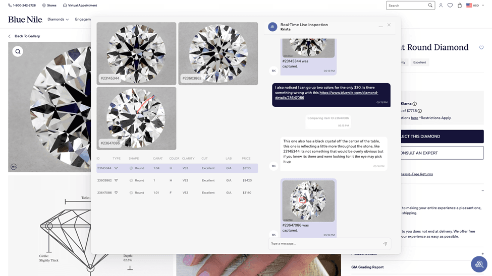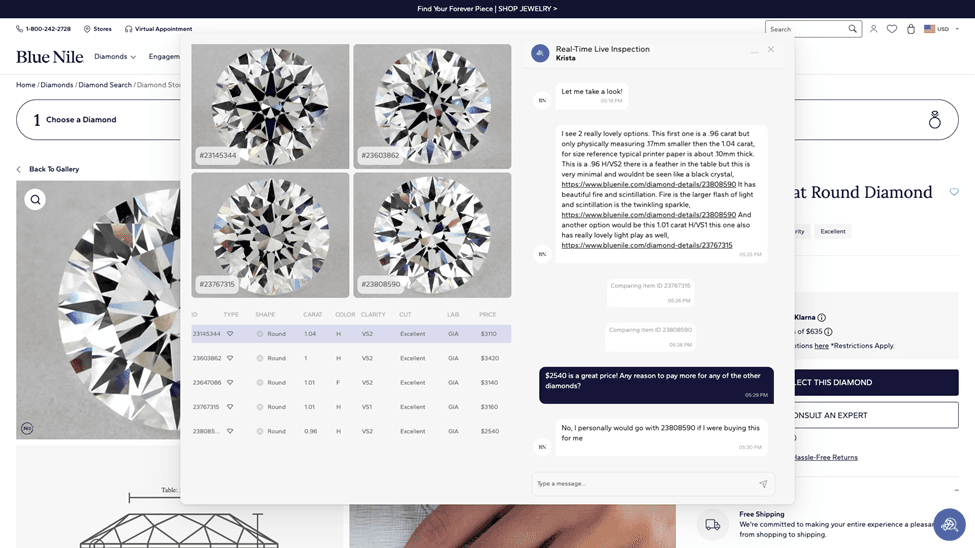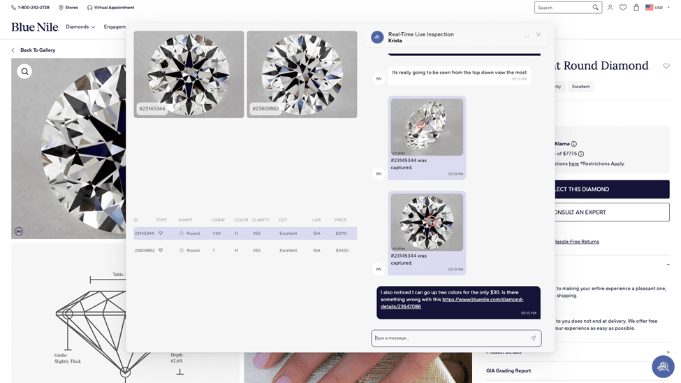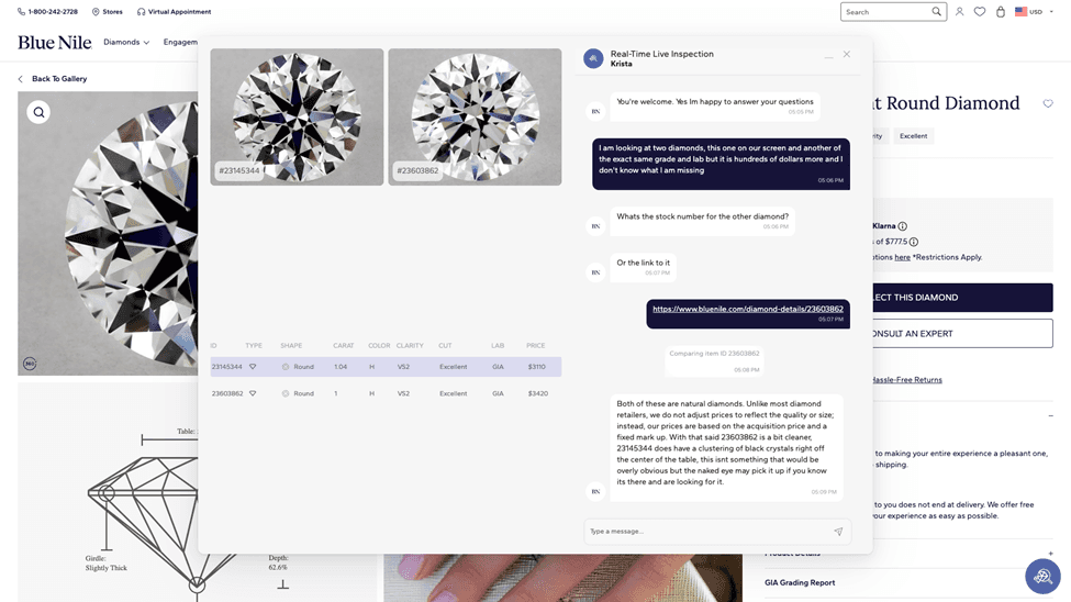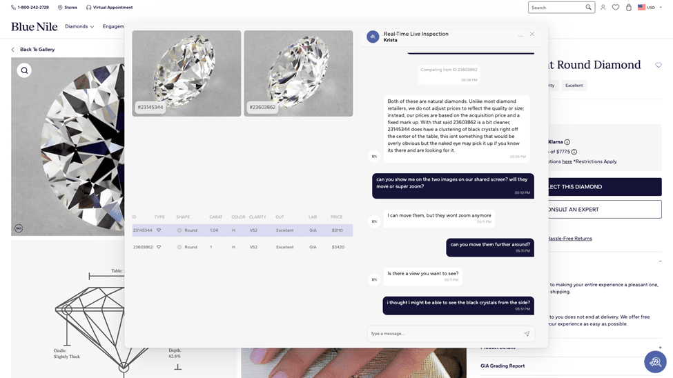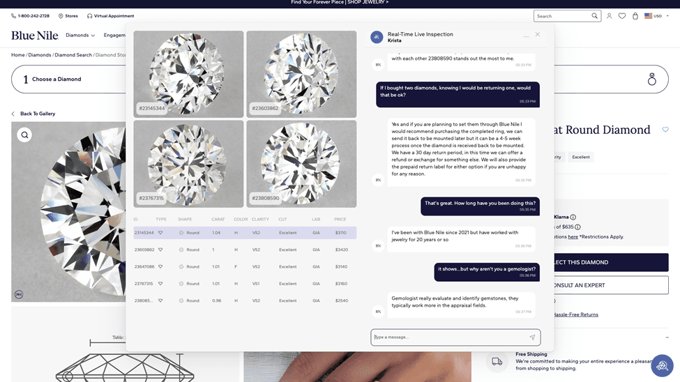 In our Editor’s instant-chat he found the Blue Nile diamond expert prompt, knowledgeable and patient in teaching and later suggesting alternative diamonds as options. We opened with a question about two diamonds and they instantly populated our screen