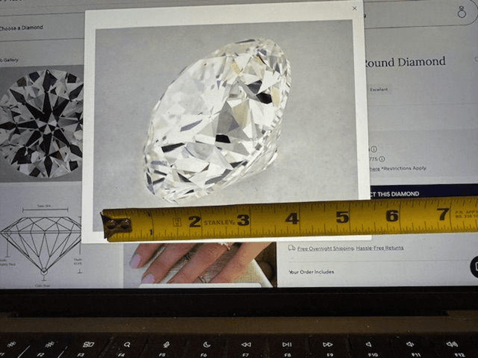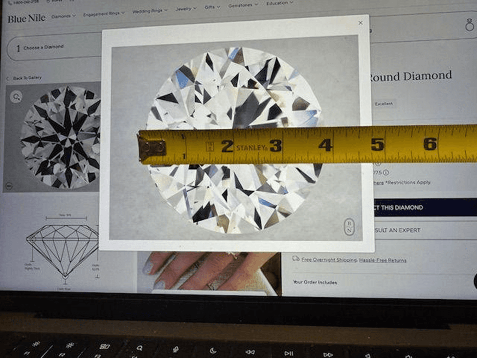The GIA certificate of the diamond shown measures the diameter is 6.40 mm or ¼ of an inch! This same diamond measures nearly 4 inches on my Mac and 2 inches on my iPhone: