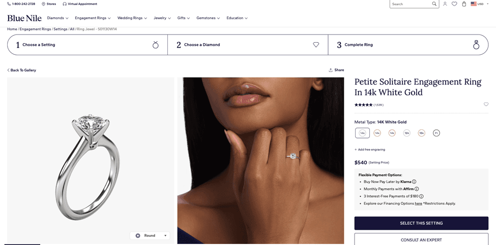 The breadth of the Blue Nile diamond engagement ring assortment offers everything a discerning consumer might want. Their Petite Solitaire Engagement Ring in 14kt White Gold, a classic solitaire setting is not only beautiful but can be customized to five different gold variations and platinum. The pricing of the solitaire ( on February 27, 2025), at $540, is the very best priced solitaire we found: