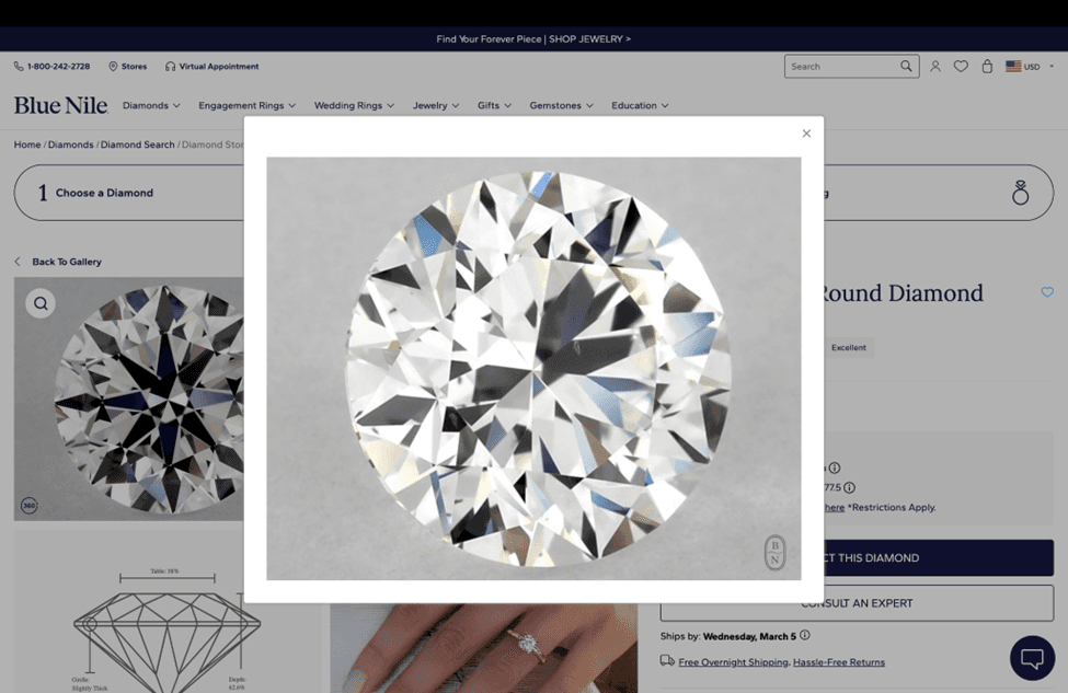 As a shopper gets closer to a final decision, Blue Nile uses the R2Net technology to “Super Zoom” any diamond on the site. Here is an image of Super Zoom on my 15 inch Apple MacBook: