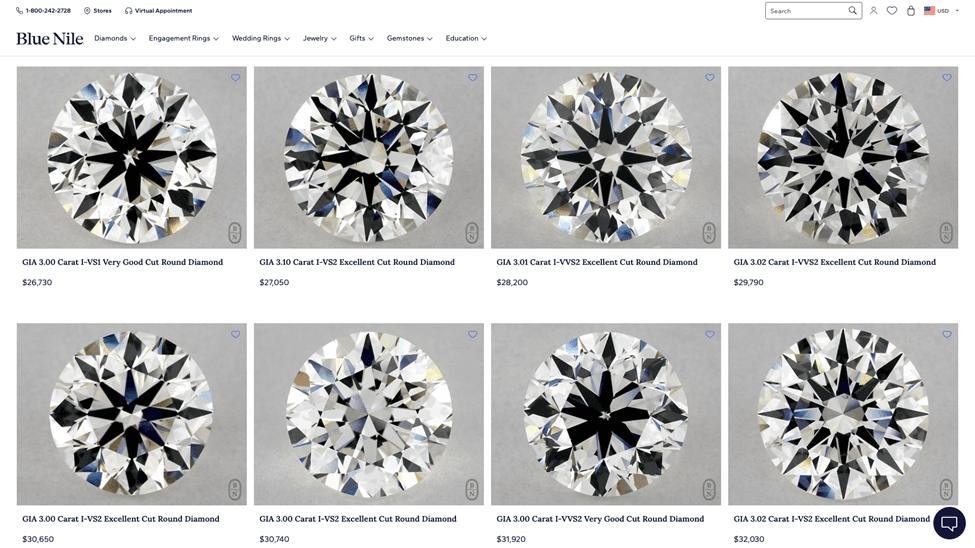 As an indication of their positioning as the premier luxury online jeweler, Blue Nile was observed to offer more of the very rarest, larger carat weight, GIA certified diamonds in the world, D Flawless, than any of the top online jewelers.