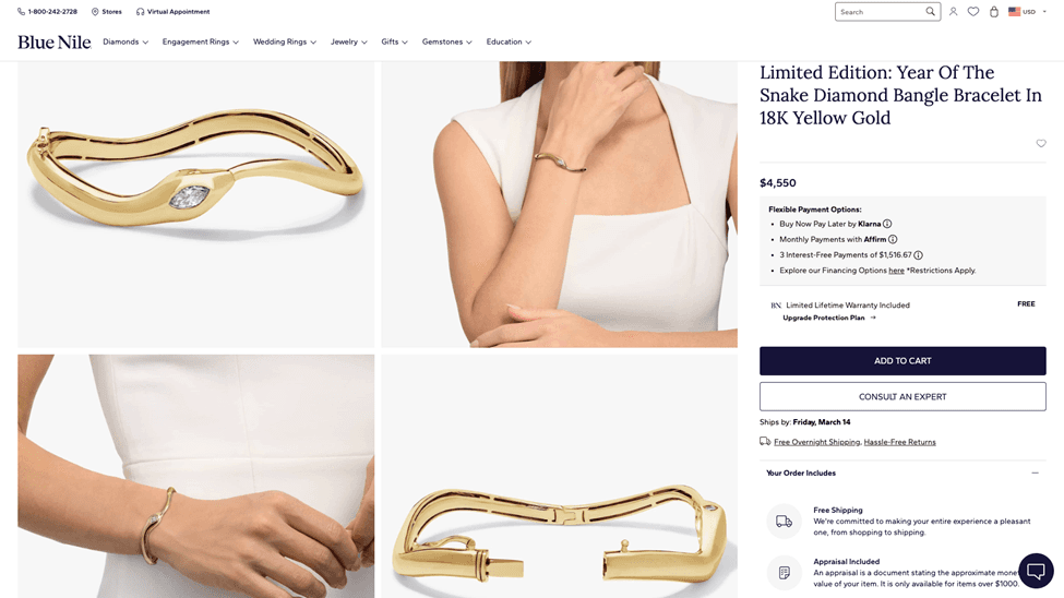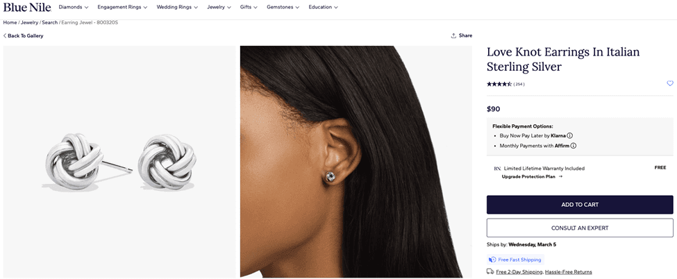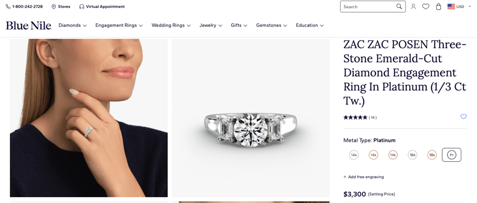 We like the broad and deep offering of jewelry for every price point and every one of life’s special moments that Blue Nile offers. Some, however, may feel there are too many choices. The company does try and address this by including a search by price feature as well as robust conventional searching tool.