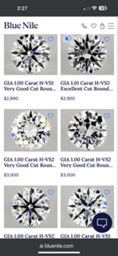 Our Editor and team were early pioneers in the validation and acceptance of lab grown diamonds in 2017. Over the last eight years, the technology for growing gem quality diamonds has improved, expanded and consolidated in the low cost centers of India. This has resulted in the price of lab grown diamonds coming down enormously. Because the cost of lab grown diamonds have corrected so much, the founder strongly advises consumers to only consider buying the topmost qualities, with 1 carat, F VS2, ideal cut as the minimum carat, color and clarity (more on this later). Blue Nile makes shopping for a lab grown diamond much easier by curating and limiting their assortment to what is best for consumers: The majority of the lab grown diamonds for sale on Blue Nile were 1carat, FVS2 or better. We appreciate Blue Nile pre-selecting the lab grown diamonds available on their site as it makes the buying process that much simpler.