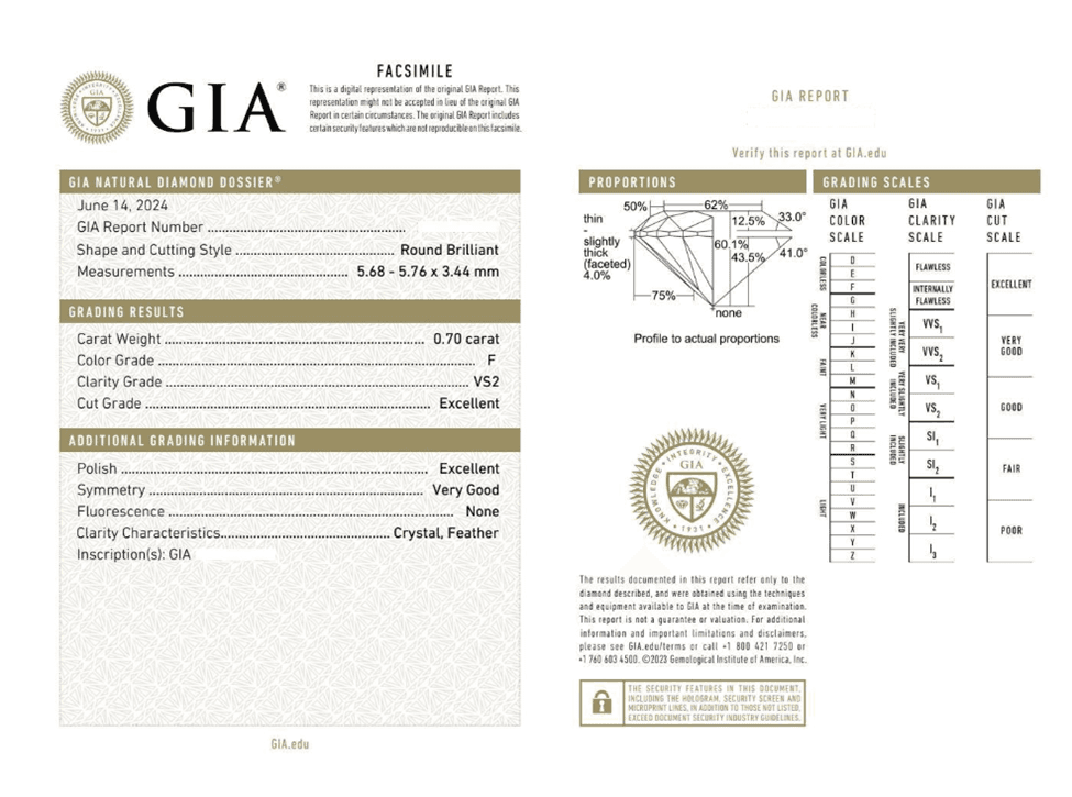Our team have produced a detailed analysis of the different natural diamond cuts and shapes offered by Blue Nile on February 23. 2025 to develop a comprehensive conclusion of Blue Nile's natural diamond assortment, including over 86,000 round diamonds representing 58% of their available stones at the time of the analysis. Here is a sample GIA certificate we selected randomly from the Blue Nile online diamond store: