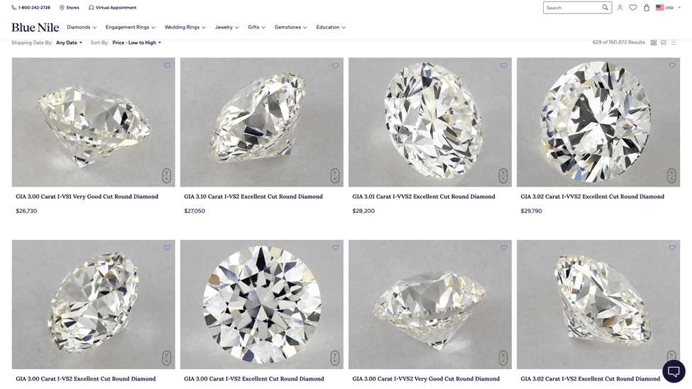We appreciate and respect that unlike most other online jewelers, but like most guild or luxury stores such as Cartier, every single mined diamond offered for sale by Blue Nile is certified by the GIA and no other gemological laboratory. Our analysis yielded observed the count of non-GIA certified diamonds on the top three online jewelers on February 23, 2025 and concluded while other top brands had anywhere from 1,960 to 13,380, Blue Nile had 0.