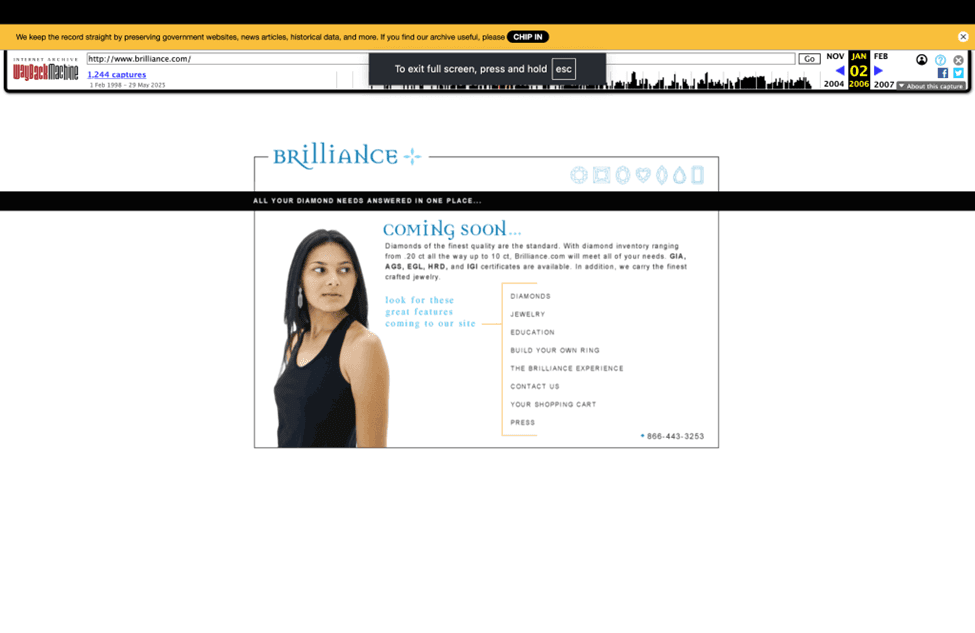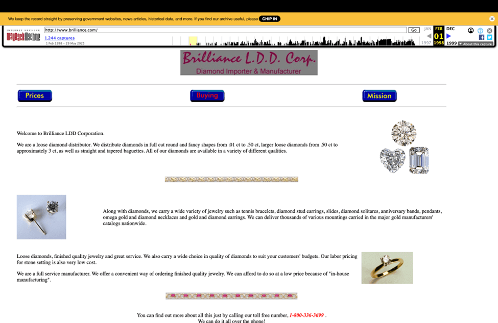 We did not discover the first transactional, ecommerce version of Brillliance.com until early 2007. But even before that, in February of 1998 do we find its origins: