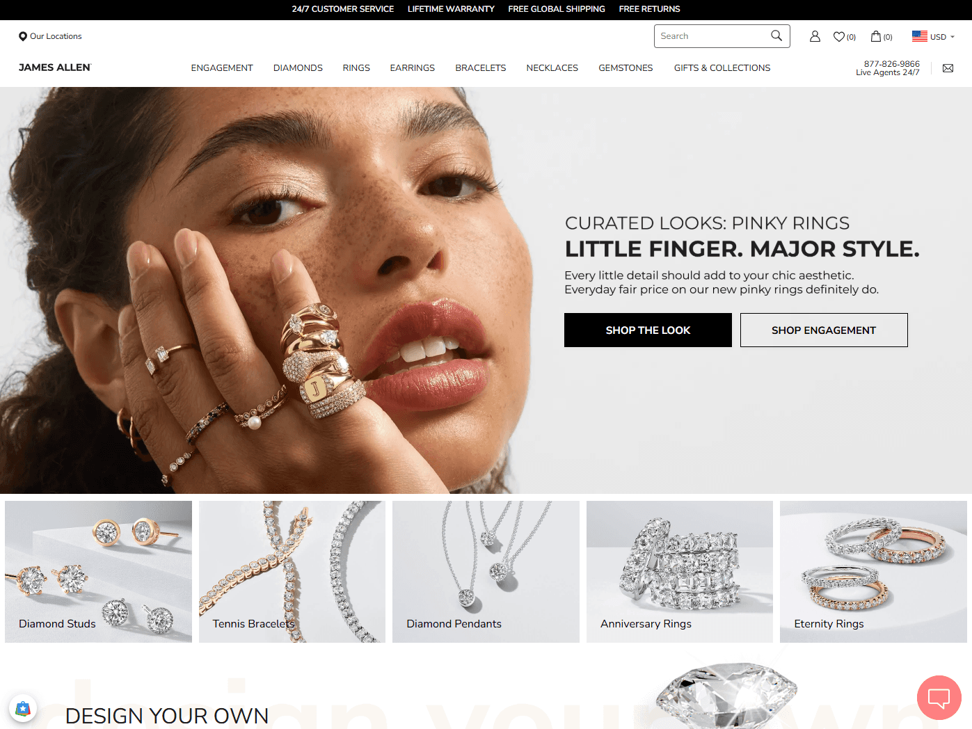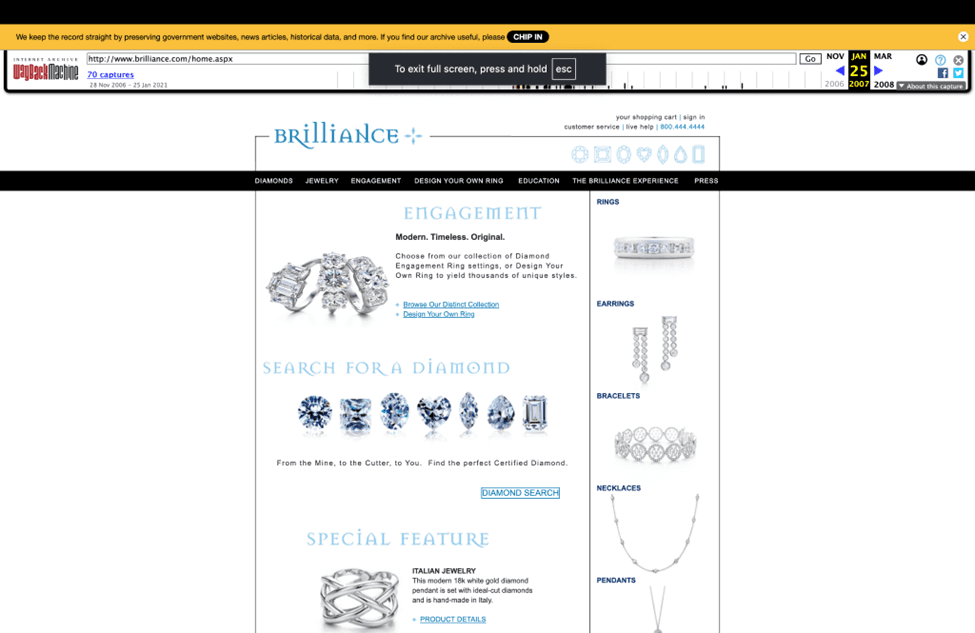 Our research found the first appearance of the company online was in 1998, when it was a static website with an 800 number for placing diamond and jewelry orders “ at a low price because of in house manufacturing”. From the beginning the message and intent was to cut out the middleman and go straight to the consumer.