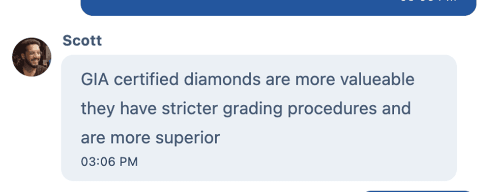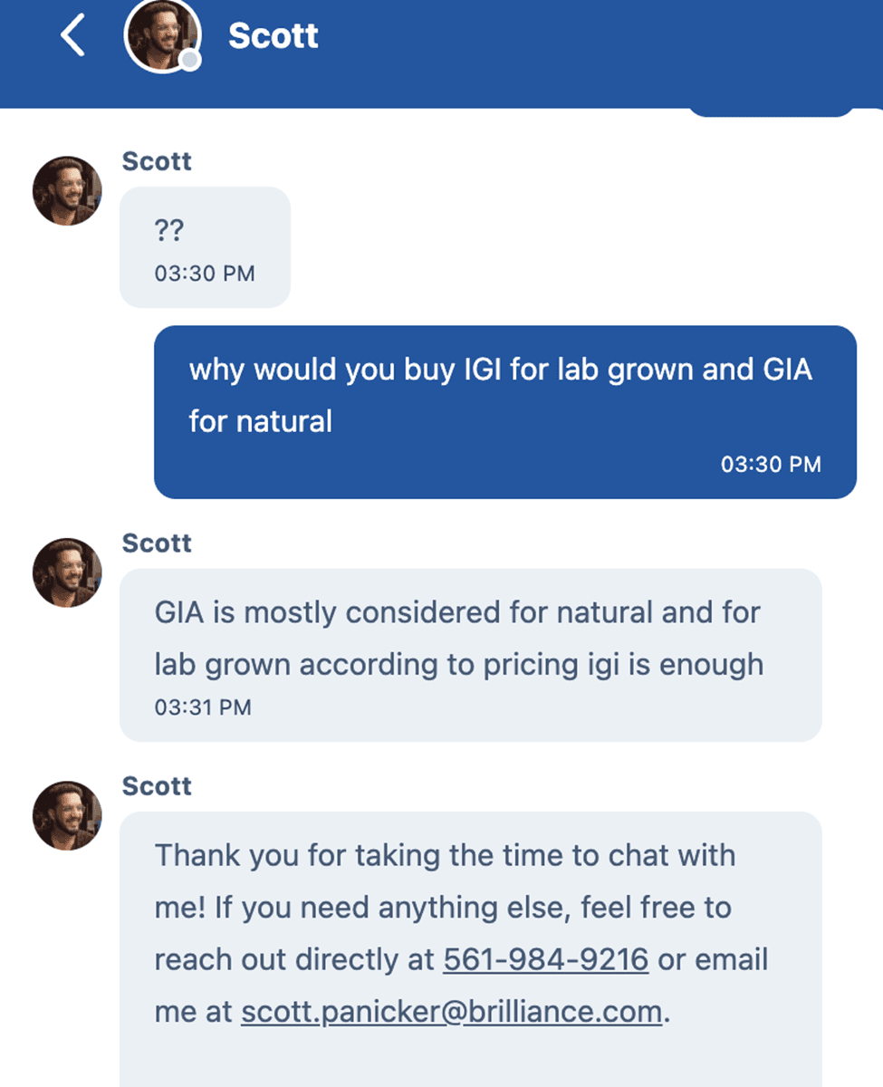 We prefer the back and forth with a trained expert to slick website technology and many shoppers do as well. Rather than spend a fortune on ever changing technology – and having the high prices to pay for it – Brilliance brings the jewelry store experience to the online consumer. The diamond, diamond engagement ring or diamond jewelry shopper will go as far as they can on the website and then it is expected a custom, high touch and highly personal engagement with an expert can begin. We were connected with ‘Scott” who was a highly trained GIA graduate gemologist. He was not only knowledgeable about lab grown, mined and the right gemological laboratory to use, but he offered up his email and direct phone number at the end of our chat: