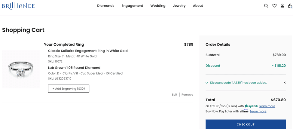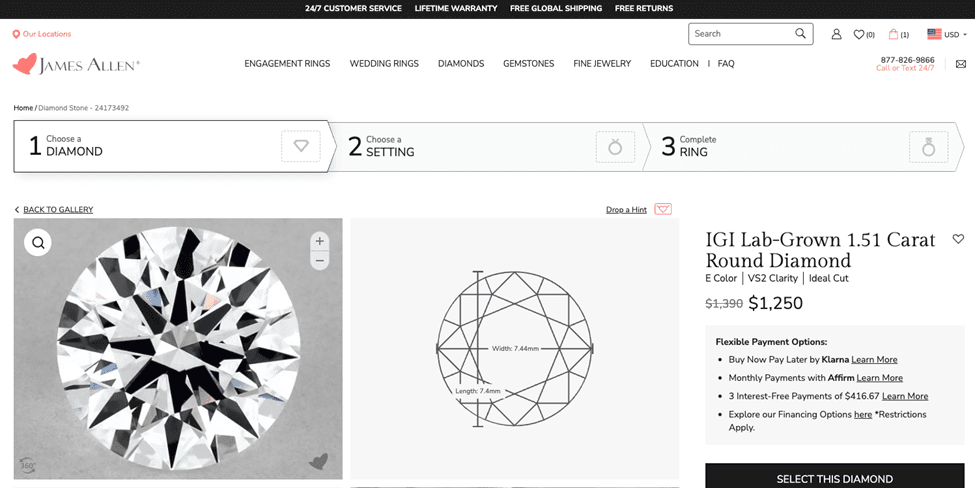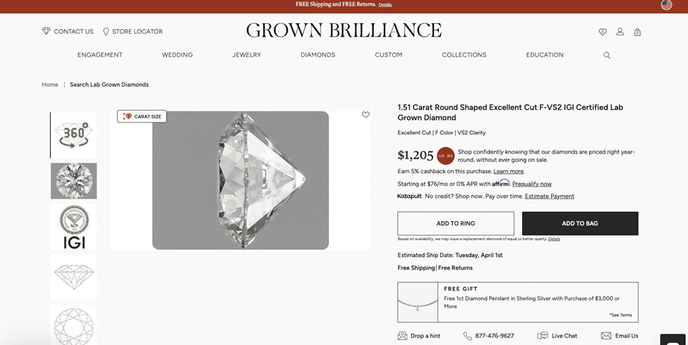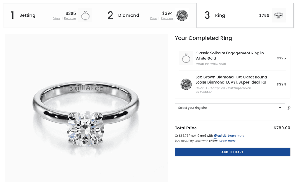 By not cluttering their site with smaller sizes of lab grown diamonds, Brilliance serves diamond shoppers well and spares them the confusion that would cause. With a 1.10 carat, D VS1 lab grown diamond selling for $358 and a 3/4ct selling for $313, consumers should not consider anything less than a full 1 carat when buying a lab grown diamond. Brilliance saves customers a lot of time and spares them confusion because most of their lab grown diamonds are over 1 ct.