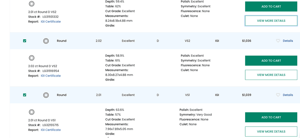 We then selected the ‘details’ tabs on the right hand side and were able to compare the specifications of each diamond