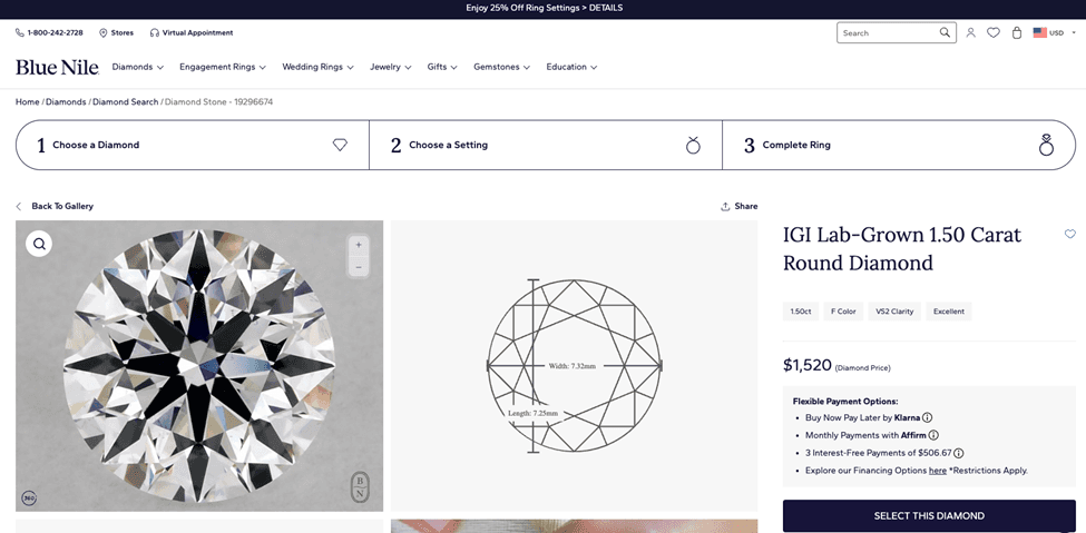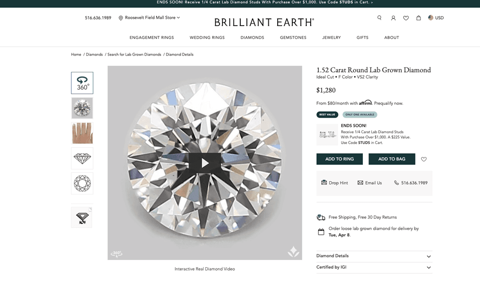 Brilliance does not dazzle with its website. It does everything a consumer needs it to do simply and efficiently but with very little elegance. It’s not slick nor particularly pretty and it can be a little bit clunky, especially the mobile version. But it is remarkably easy to navigate more than 2,000,000 diamonds for sale and select the ones a shopper wants to further explore on the desktop version. Little things are annoying, like the absence of a back button when you view a diamond and want to view another. Our experts ended up with a dozen open tabs on our desktop for each diamond they looked at and had to manually return to the home page to select another. Each diamond description page, however, was thorough, giving full details of the specifications of each diamond and easy summaries. And the still and video images of each diamond were spectacular.