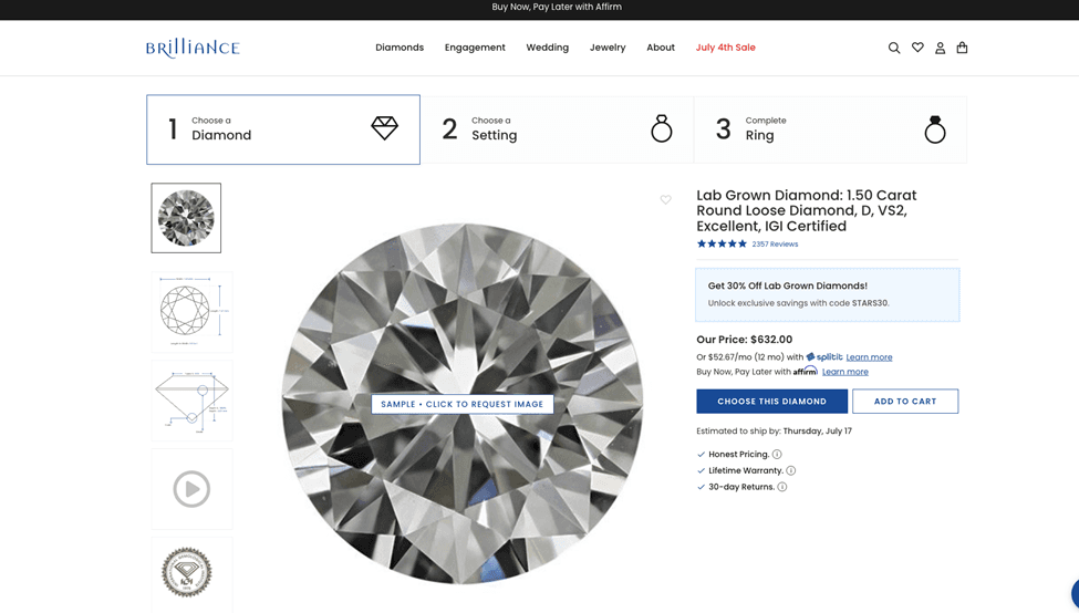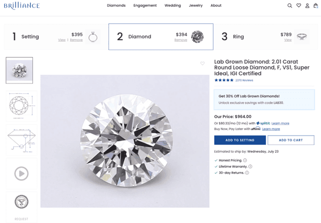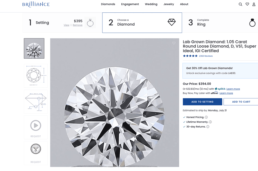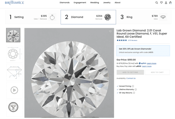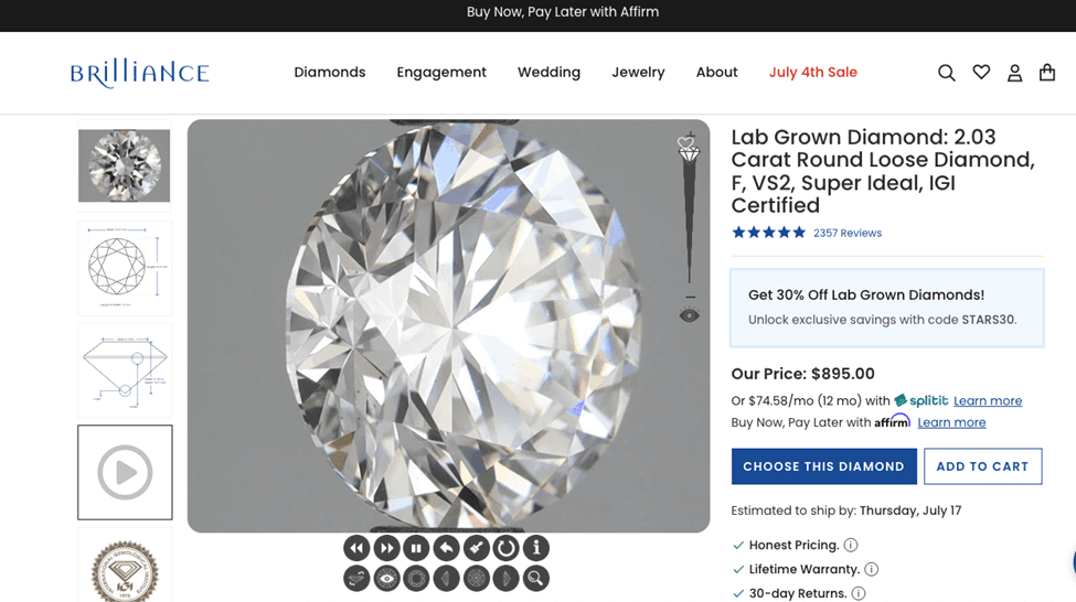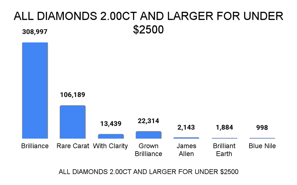 Brilliance must have the most vendors posting diamonds on their site because no jeweler in our survey had more. They have every diamond you could ever want, from a 1/5ct natural diamond for $150 to a 12ct lab grown diamond for $37,580 .