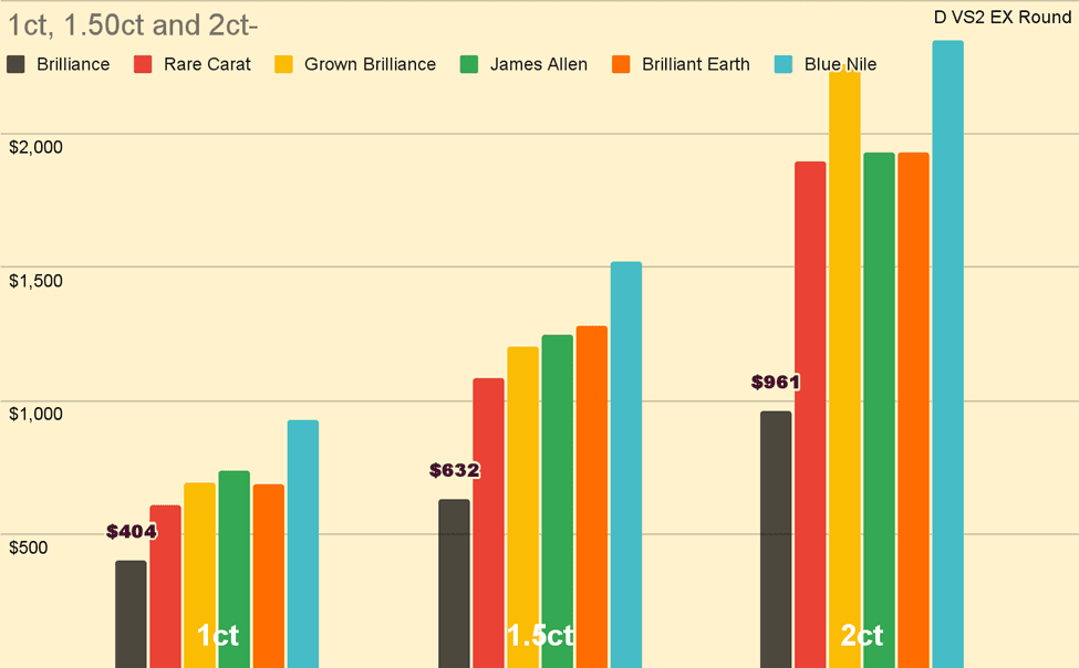 In one survey of several of the most significant online retailers of diamonds, we compared the prices of 1, 1½ and 2 ct D VS2 excellent cut lab grown diamonds certified by the IGI. The results make a compelling case for why consumers would be wise to visit Brilliance for their lab grown diamond needs and why their marketplace model serves diamond shoppers like no other.