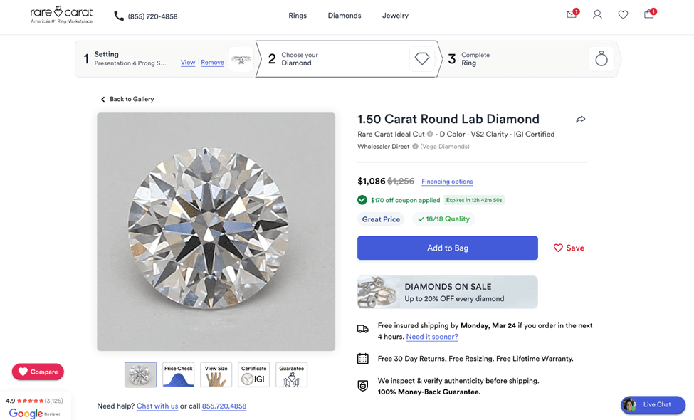 Unfortunately not every GIA or IGI report was available on the site and we had to give our email and request it. Clunky. But there is very little pushing a consumer to buy. There is no recommender tool, no chatbot constantly popping up to ask if the shopper needs help and no real computerized help either. That is because Brilliance does this the old fashioned way: with a human. 24/7 their chat is manned by trained gemologists there to answer questions.