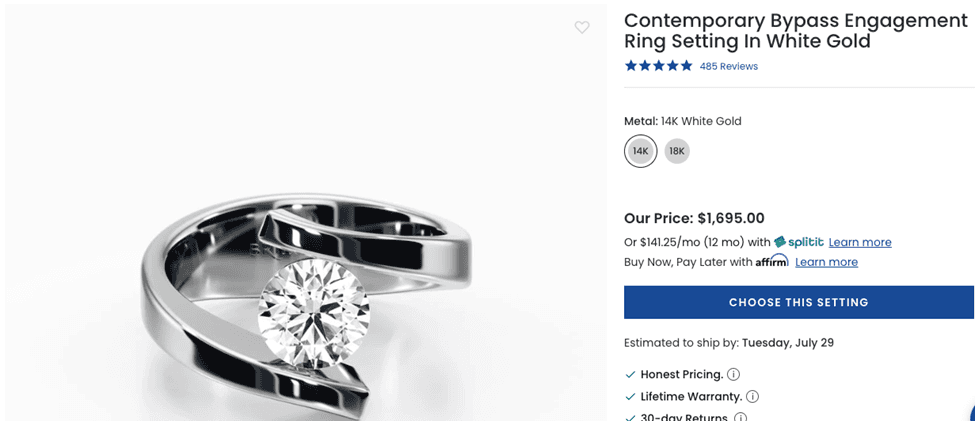 But consumers should not be concerned that the focus of Brilliance is only cutting edge, on trend designs. The most popular designs–timeless classics, are well represented and their pricing is the very best in our survey. For an entry level shopper, perhaps a young couple looking to get engaged and pull together enough money for a down payment on a home, , their classic solitaire setting is not only beautiful but can be customized to five types of gold colors or platinum. The pricing of this 14kt gold solitaire (on July 9, 2025), at $395, is among the very best priced solitaires we found: