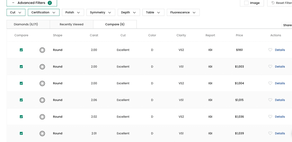 Brilliance has built their website so that comparing different diamonds is easy on your laptop. In our test we were able to compare as many diamonds as we wanted to. We selected these six diamonds to compare: