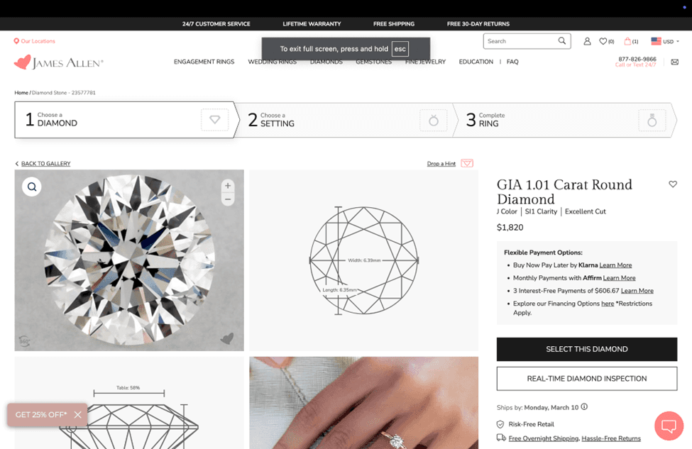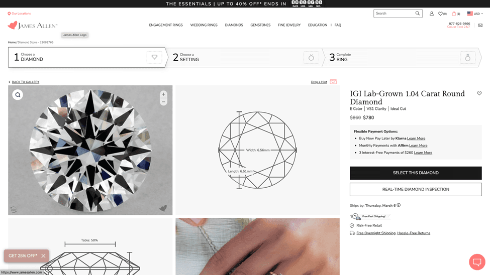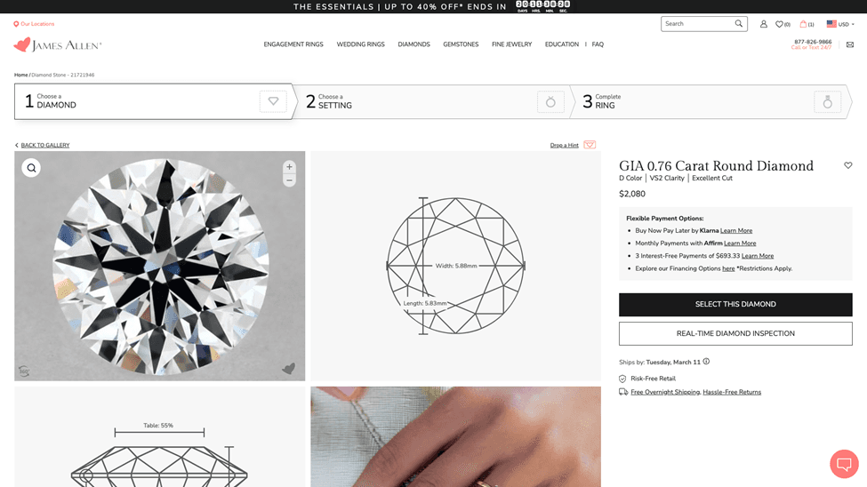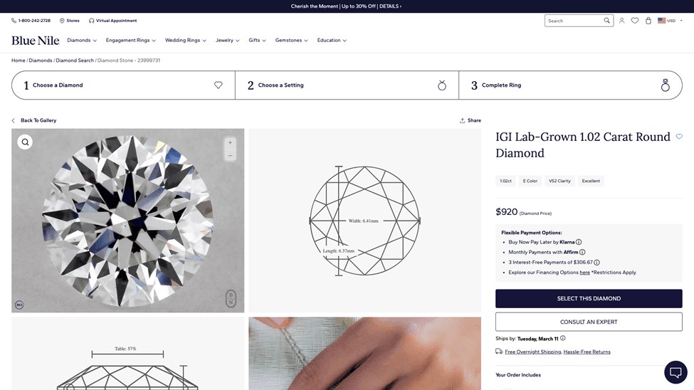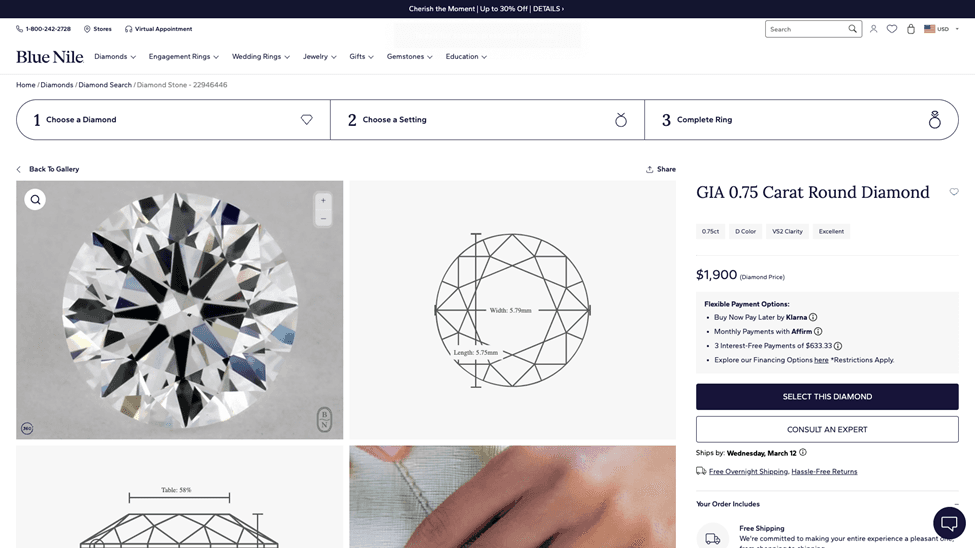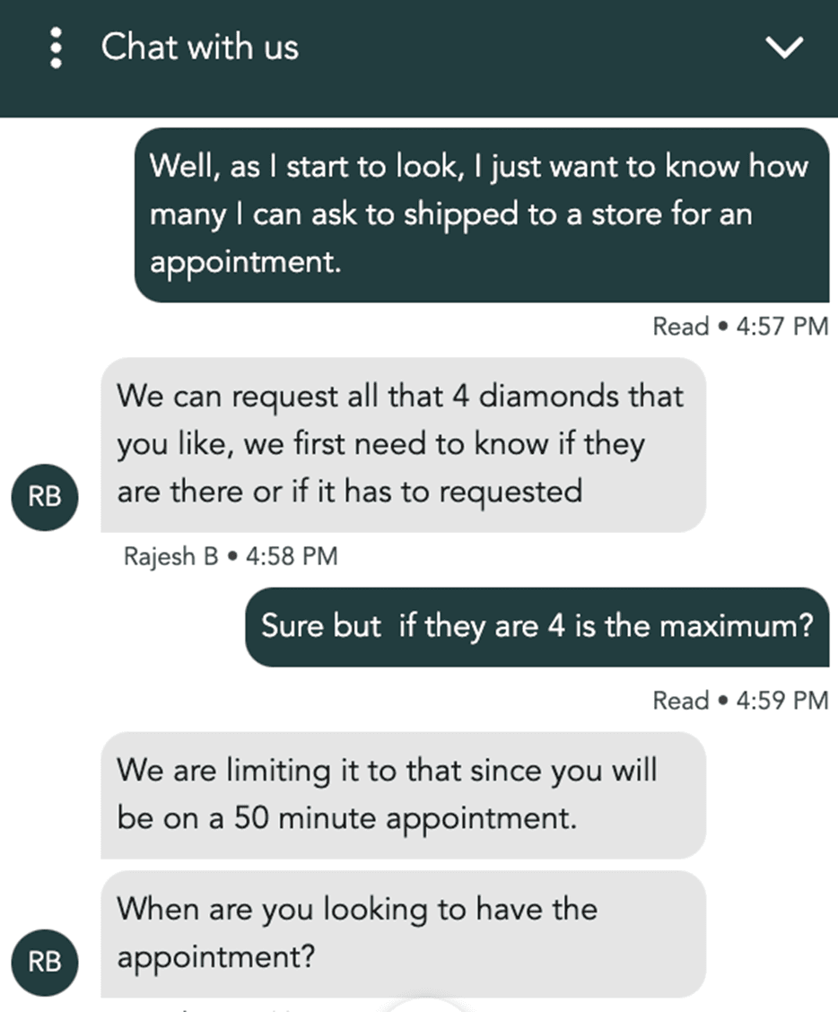 As we closed our virtual appointment, she invited me to select any 5 diamonds I wanted to see and she would arrange a private viewing with a trained gemologist at their showroom very near me.