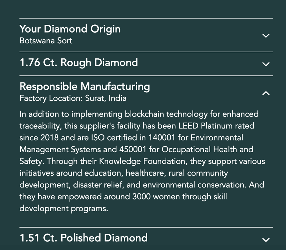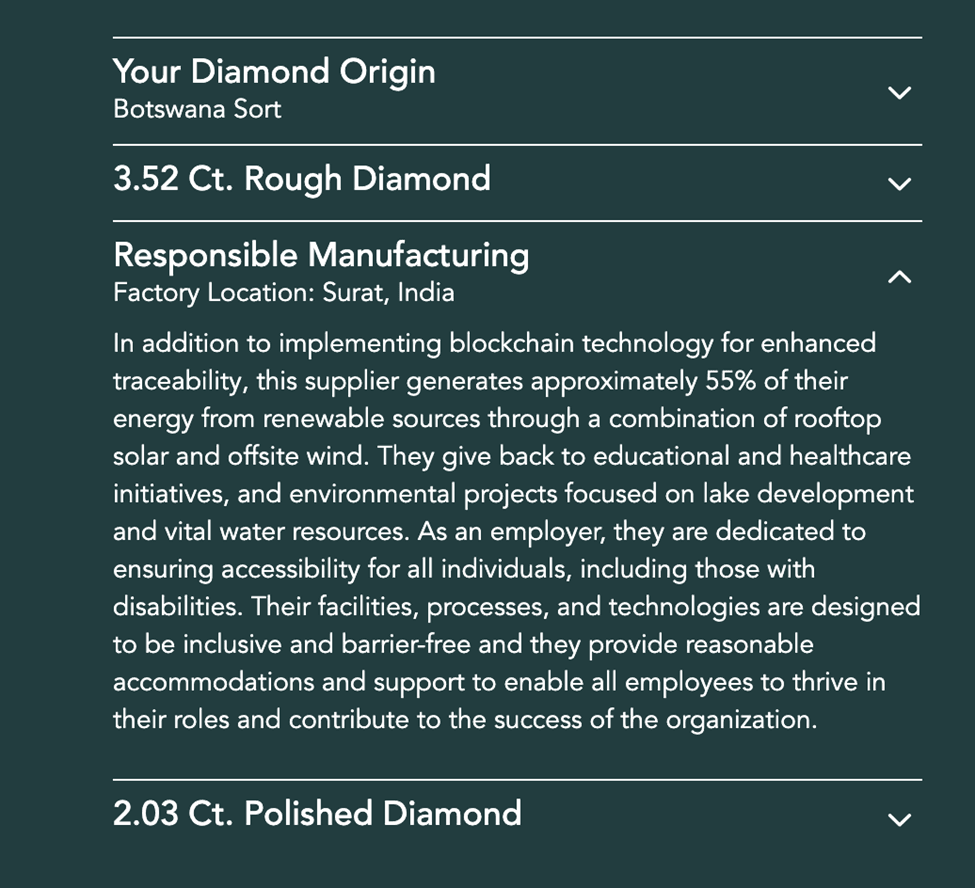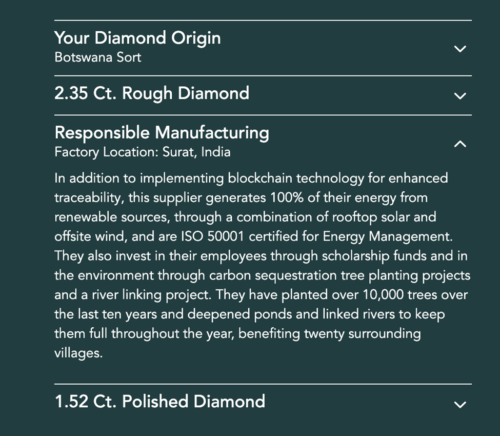 And for the consumer to whom sustainability is important, Brilliant Earth again sets a standard of transparency by disclosing specifics about the cutting and polishing factory of an individual diamond. Here are a few examples: