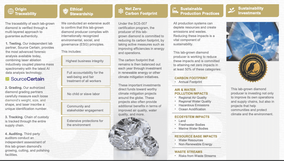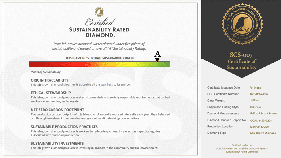 These diamonds come with a Certificate of Sustainability like the one pictured below.