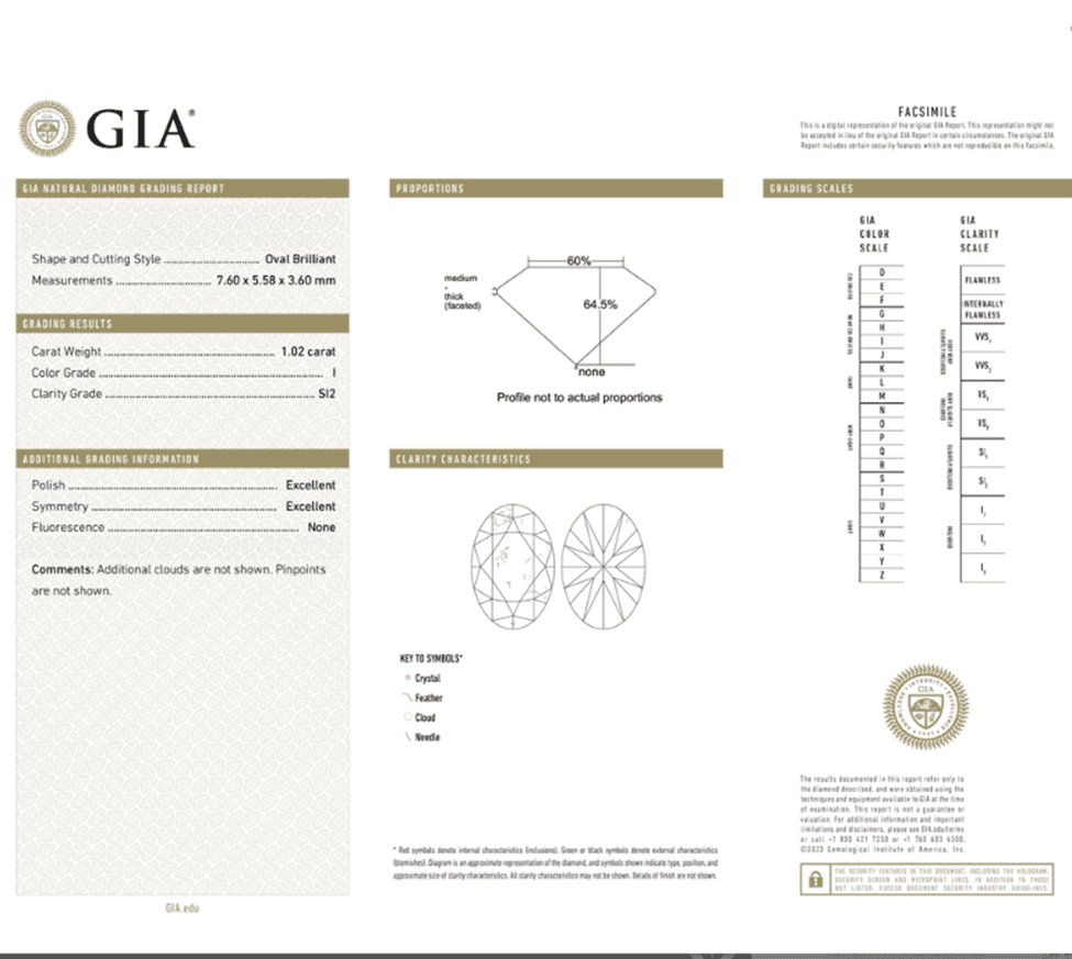 The diamond will be the most expensive part of any diamond engagement ring purchase so it is important to take the time to research and learn about the 4C’s. Our Editor explains in detail how to understand the GIA 1ct Oval certificate below: