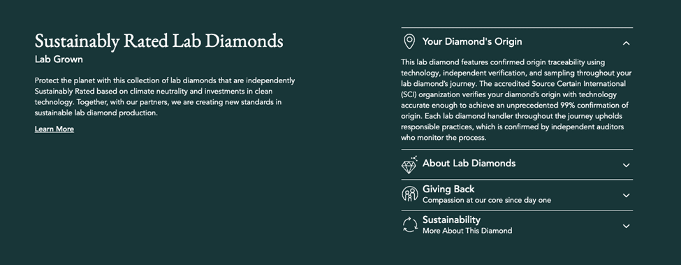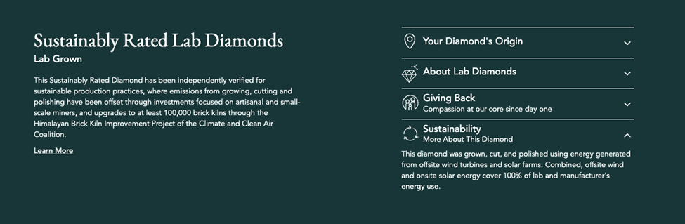 Brilliant Earth is serious in their commitment to transparency and to giving consumers choices that align with their personal values. For the consumer for whom environmental concerns are paramount they offer thousands of specially certified lab grown diamonds. These include more than 7,000 that are independently certified as having been produced with 100% renewable energy.