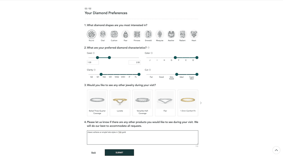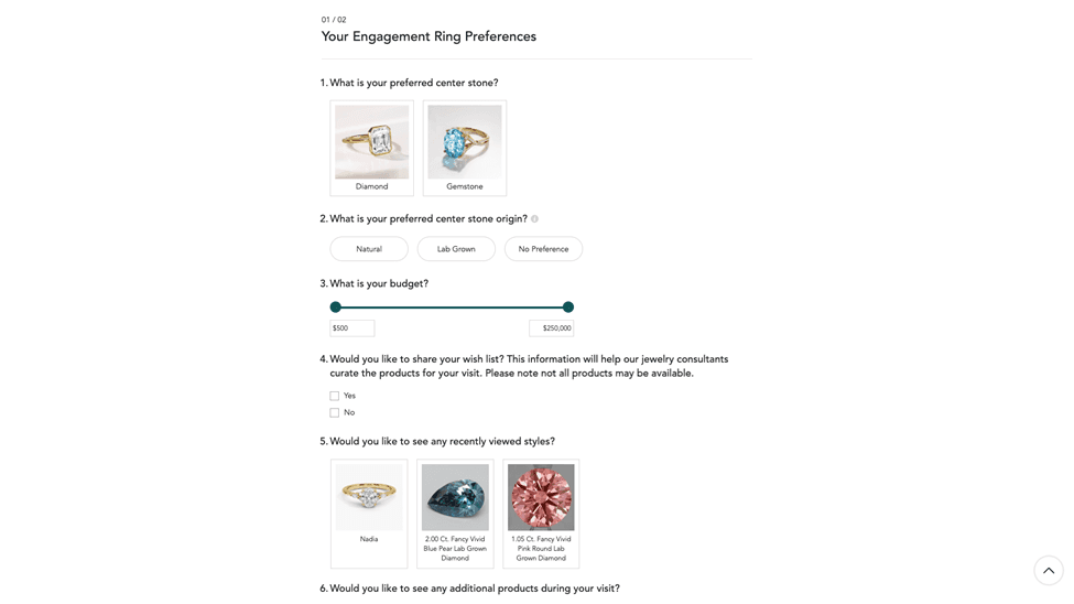 Whether by making an in store appointment or a virtual appointment, Brilliant Earth always tries to make a personal connection with each shopper and give them the respect and attention of uninterrupted time with one of their consultants. Rather than sell you what they want, it’s all about understanding each customer's needs. What Brilliant Earth offers is really a ‘concierge’ service. Here was the questionnaire I had to fill out to schedule my virtual appointment: