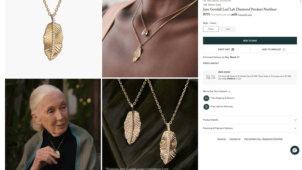 The Leaf Lab Diamond Pendant picture above is an instant classic and reminiscent of the high jewelry once produced by Cartier or Tiffany. It is the perfect gift for every woman for any occasion. The entire collection is specially produced with Brilliant Earth’s Carbon Capture lab grown diamonds and recycled gold, in tribute to Dr. Goodall’s lifelong commitment to conservation and humanitarianism. And true to the values and mission of Brilliant Earth, 10% of each net purchase price of any design in the collection will be donated to the Jane Goodall Legacy Foundation.