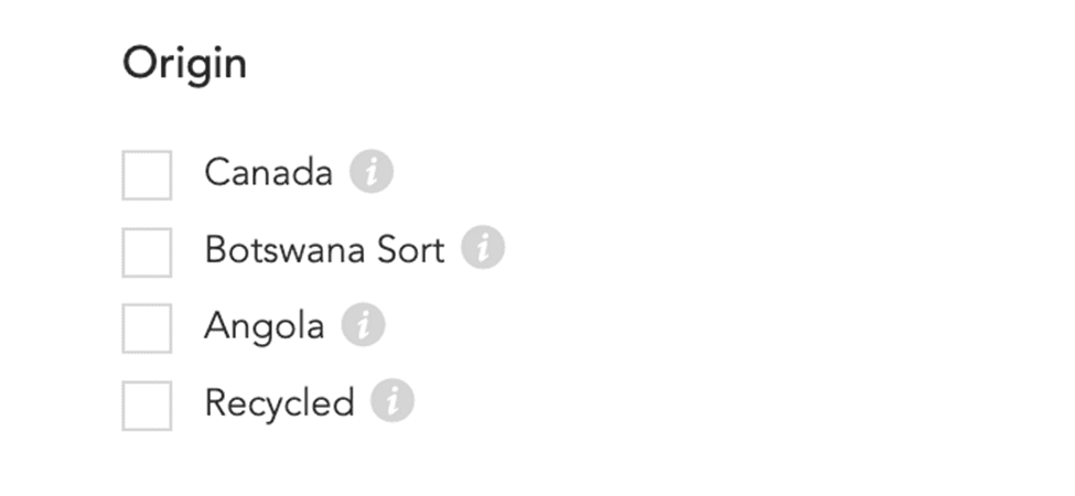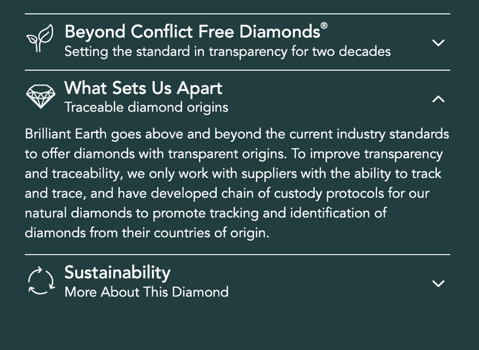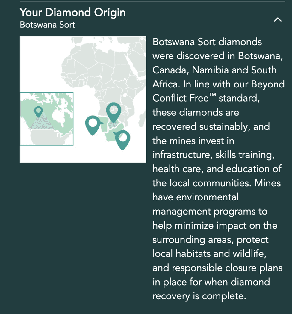 But Brilliant Earth goes a step further than any other diamond jeweler by also disclosing the provenance of every diamond and allowing customers to select their diamond according to the country of origin.