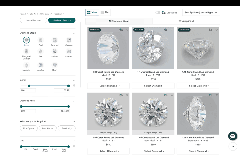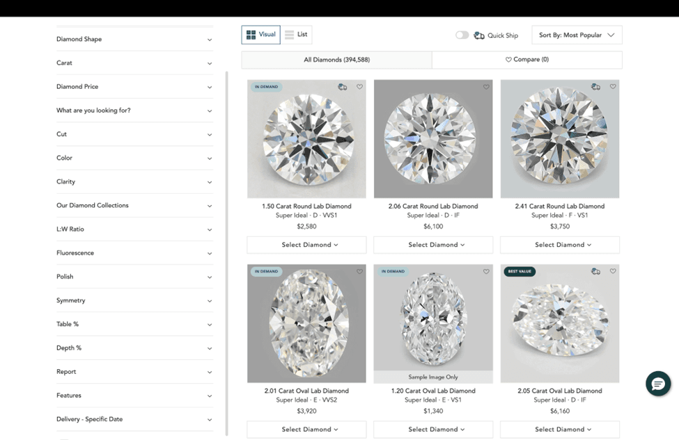 Largest selection of certified lab grown diamonds: nearly 400,000