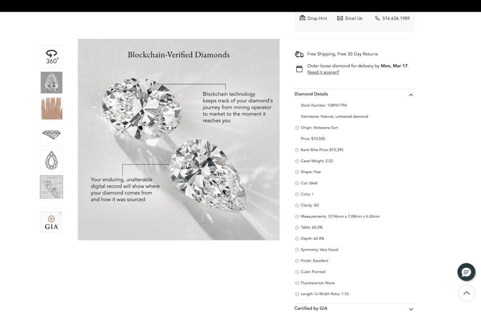 For diamond shoppers who seek even further assurance of the conflict free provenance of their diamond, Brilliant Earth is the only diamond jeweler retailer surveyed that can satisfy their requirements, because Brilliant Earth offers more than 6,000 blockchain enabled diamonds like this 2.03ct pear shape: