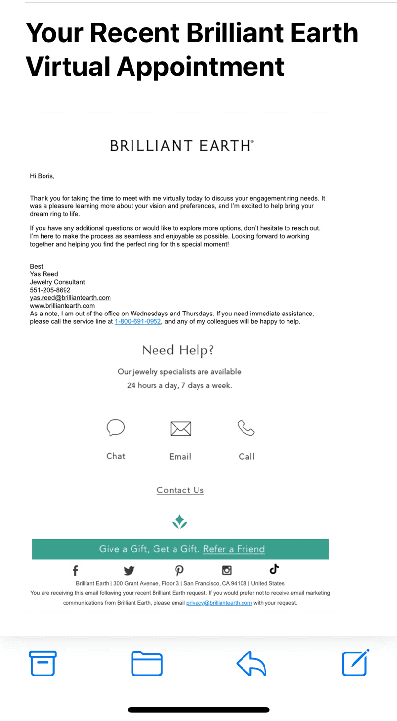 At our Editor's request the Brilliant Earth consultant followed up our appointment with an email. The email merely offers more help and ways to get directly in touch, but only if I want to. She is not pushing a sale, which is very different from a traditional store experience.