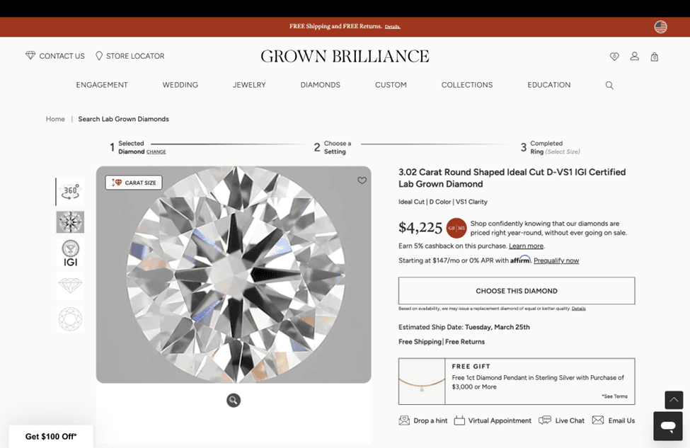 Then Grown Brilliance really surprised us. We scrolled right and the fifth similar diamond they recommended appeared on our screen. Because there are customers who only want the best color, D, Grown Brilliance included a D VS2 3.02ct diamond for $4,225.