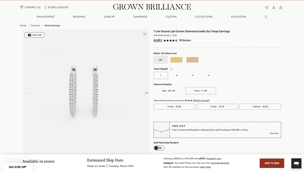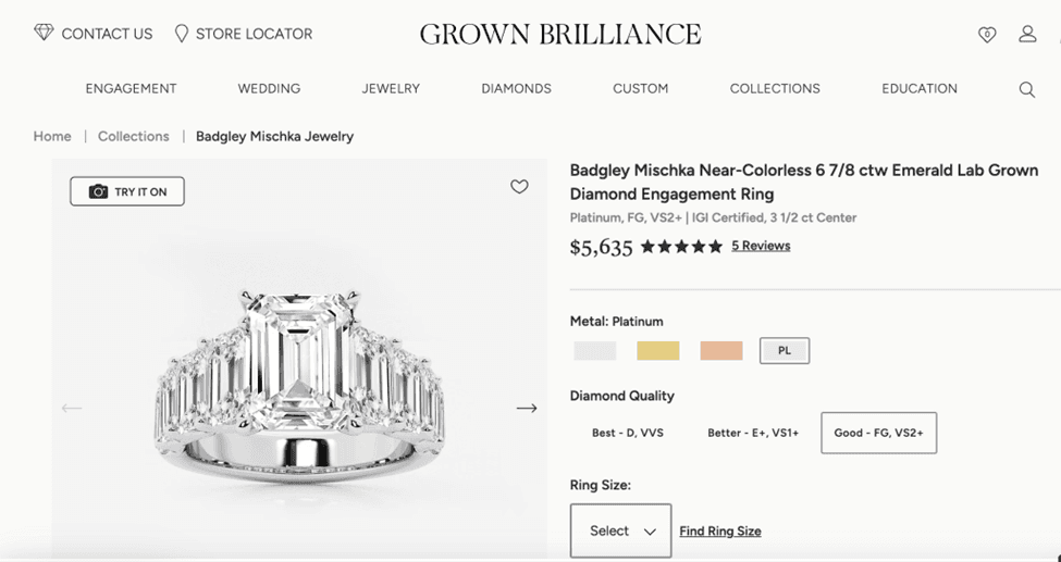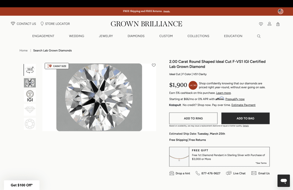 Navigating a website with 200,000 diamonds and finding the ones a shopper wants to explore requires fast, up to date technology that works on your phone as well as it does on your laptop. Grown Brilliance is the newest of the major websites and it shows in the simplicity of their cutting edge technology. Whether in a store or online, a careful consumer will want to closely examine and compare many different diamonds. Grown Brilliance has 360 degree unique videos for every diamond. Our Editor feels strongly that consumers are best served beginning their search for the perfect diamond online because they can view and compare many diamonds. This system is vastly superior to what is available in traditional jewelry stores. Because Gown Brilliance has so many mall stores, however, consumers can have the best of both.