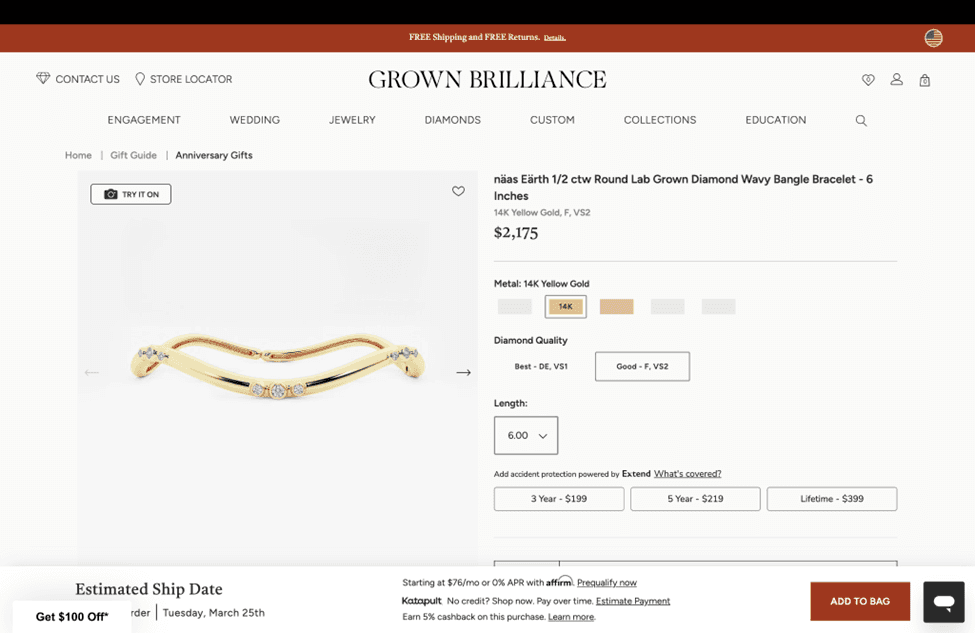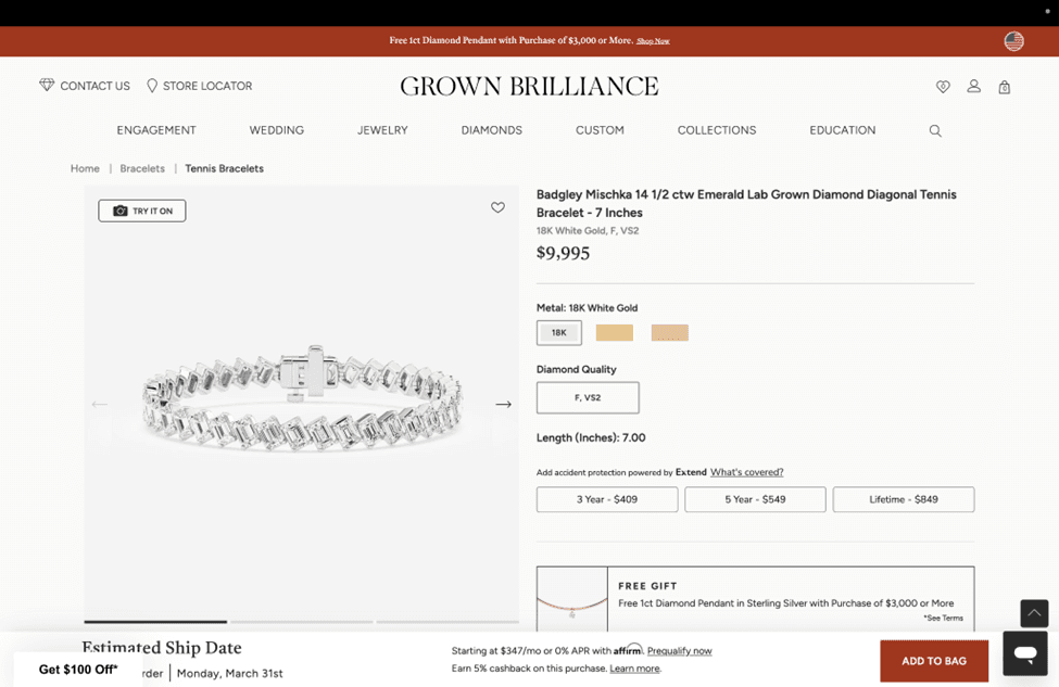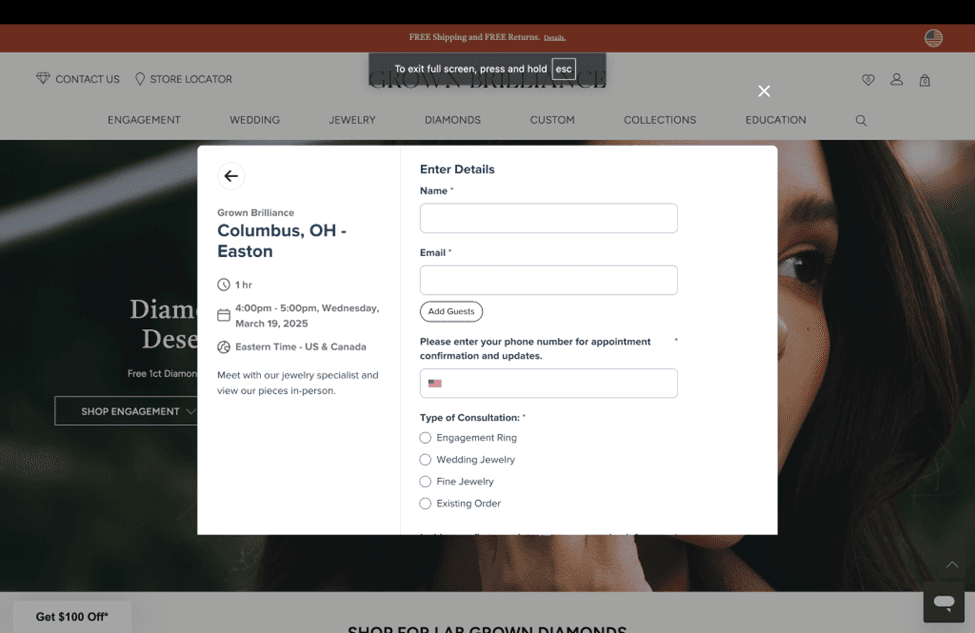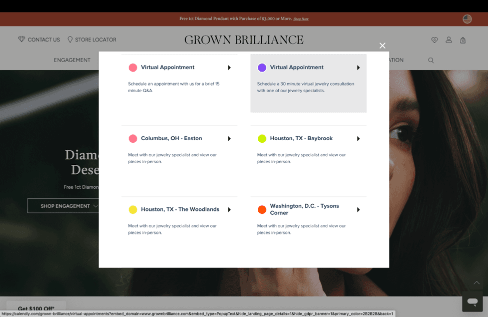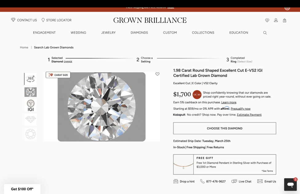 Having a person and not a robot on the other end of a phone call or a chat to discuss a diamond, jewelry style or the status of a purchase, repair or return distinguishes Grown Brilliance from most other jewelers. Having so many mall stores and showrooms nationwide, the most of any online jeweler, is even better.