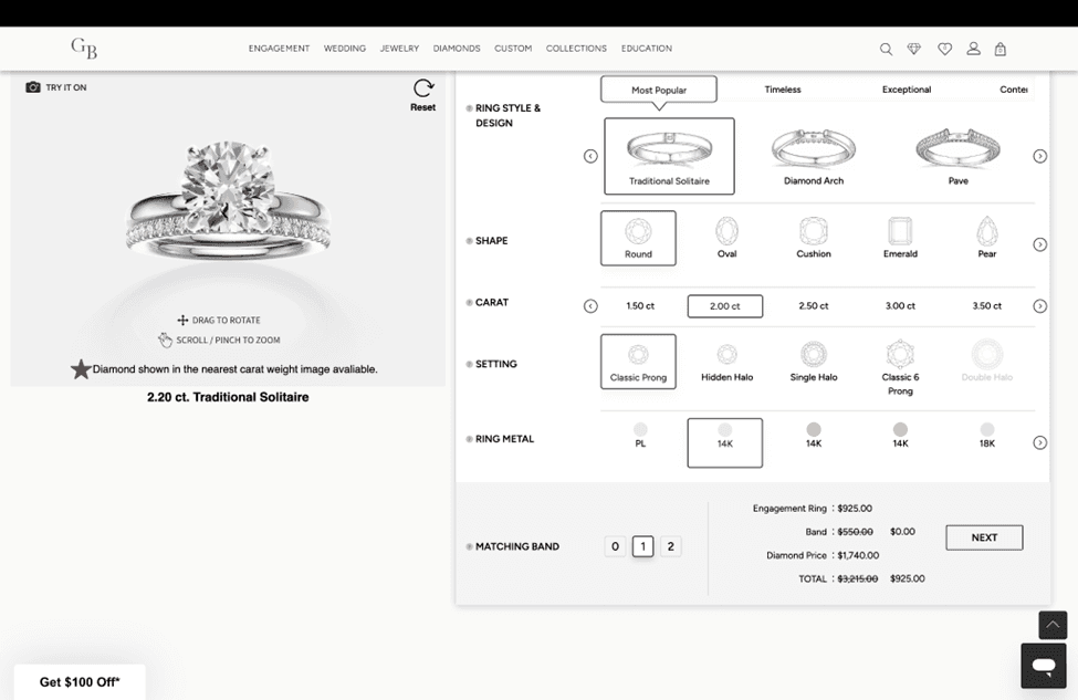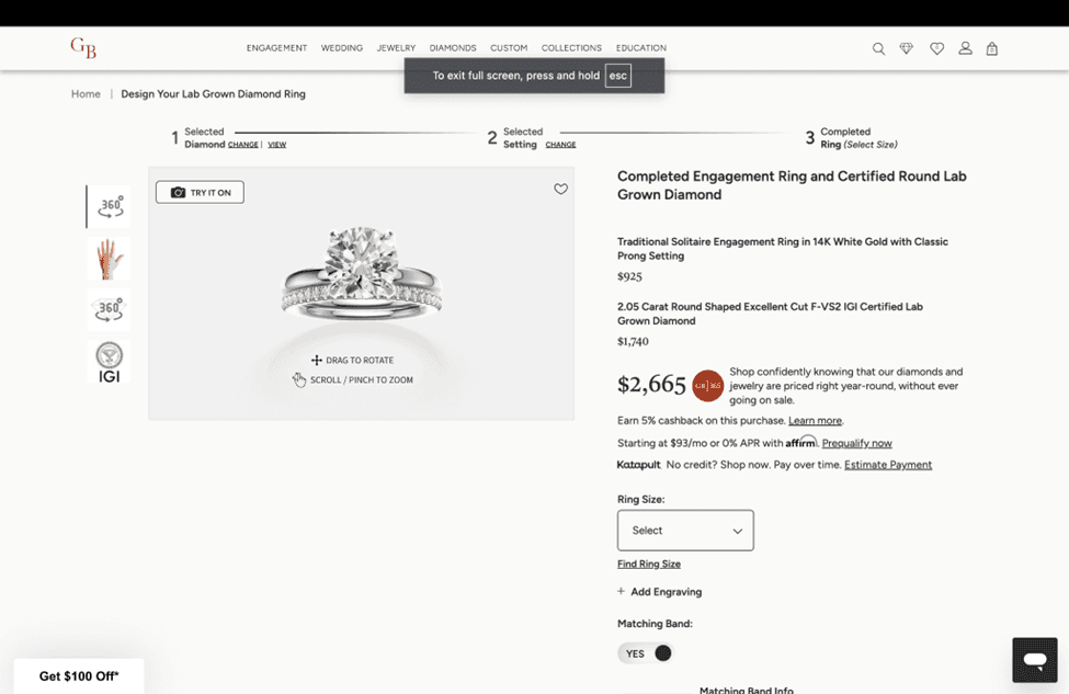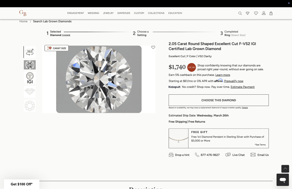 Most consumers, we know, will want a more classic and traditional design. Grown Brilliance has two ways a customer can select the diamond engagement ring of their dreams. For the customer who wants to individually select their diamond from the more than 200,000 offered, like this 2.05 ct colorless diamond: