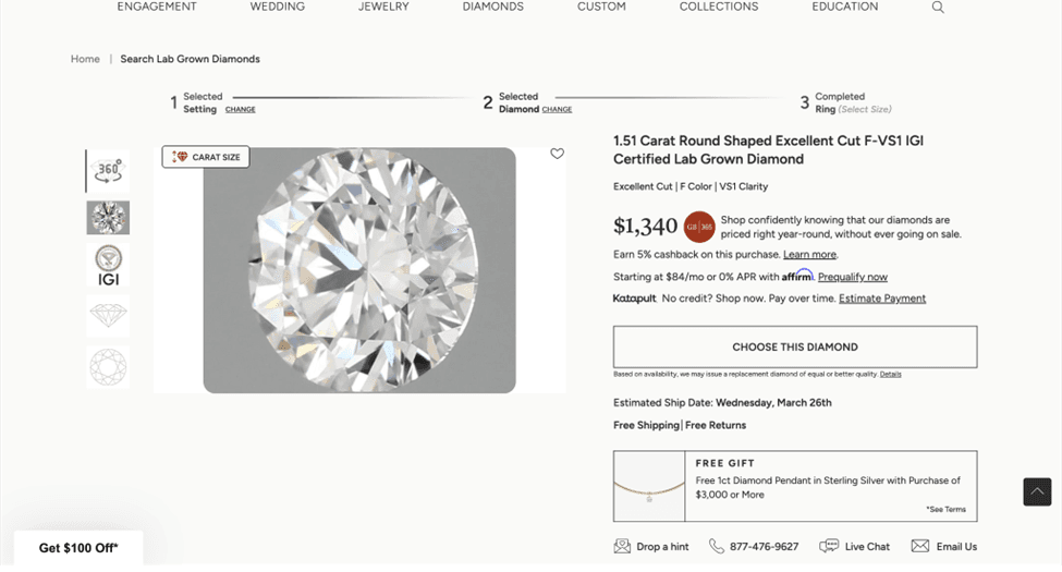 The Grown Brilliance tool allowed us to try a smaller diamond with the ring by going to the “carat” line on their ring builder and selecting this 1.51 ct diamond