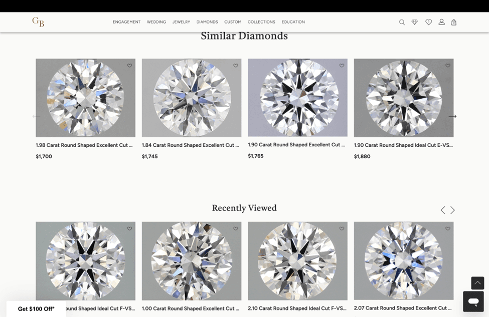 Consumers will be happy to see that Grown Brilliance began by suggesting similar diamonds that were better color but cost less money, like this 1.98ct for $1,700.