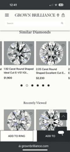 That was when we scrolled down and discovered another great feature of the Grown Brilliance website. We could view eight additional diamonds all at the same time. We could see side by side images of all the diamonds we had recently viewed, four at a time but we could scroll right and see them all. And on the same screen Grown Brilliance showed us four similar diamonds, and again we could scroll right and see even more.