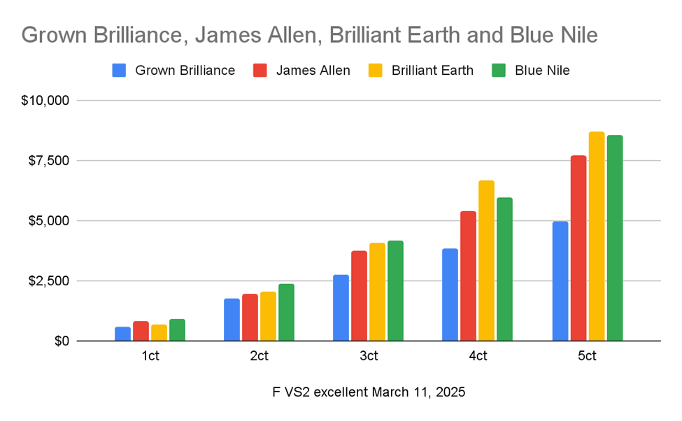 Grown Brilliance has the best prices by hundreds of dollars in 1ct and 2ct diamonds and by thousands of dollars in 3, 4 and 5ct diamonds. For the diamond shopper who only wants the best–the best diamonds AND the best prices Grown Brilliance is the best. Take caution however, that any price leader often taunts other retailers down to their prices and there are often price matching programs not advertised that you should discuss with retail and customer service associates that could save a few hundred to a few thousand dollars if you're well informed. Also ensure you're getting what you need from an aftercare standpoint, so you're comparing apples to apples.