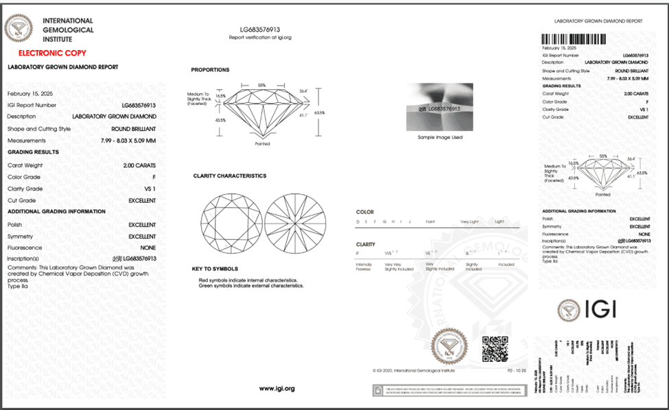 Sample IGI certificate for the diamond above from the Grown Brilliance website: