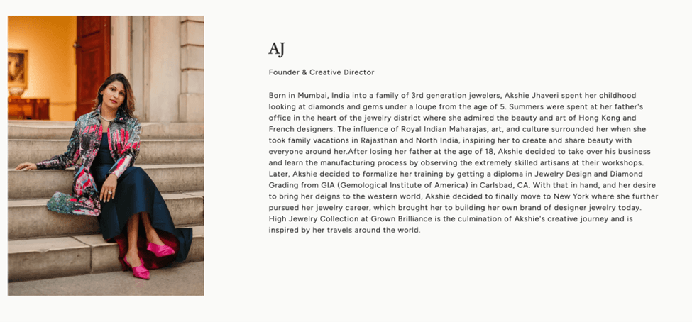 Grown Brilliance, founded in 2021, was conceived by a power couple who are among the most skilled and experienced young diamond jewelry professionals in the world, Akshie Jhaveri and her husband Tejas Shah. In 2021 Akshie founded Grown Brilliance as a passion project and expression of her personal values. No one of her pedigree envisioned the path to disrupting how couples buy diamond engagement rings. But it was obvious to her. Akshie saw the future of sustainable and ethically sourced lab grown diamonds as a way to offer 100% conflict free diamonds to a larger audience at a price they could afford. In 2023 her husband, Tejas Shah, joined to support his wife in the explosive growth of the brand she had launched less than two years before. This allowed Akshie to focus on being the Creative Director of Grown Brilliance. The results were almost instant. The design sensibility and gracefulness she brought to the creative process have catapulted Grown Brilliance to a leadership position in timelessly elegant and exquisitely crafted diamond engagement rings and fine jewelry.