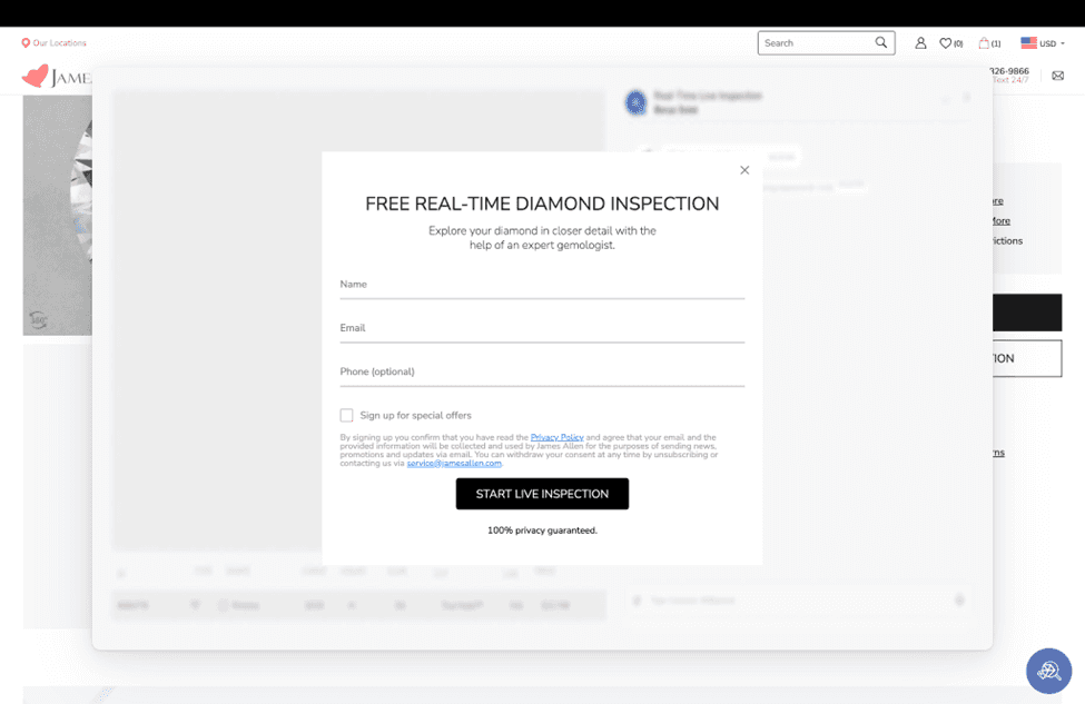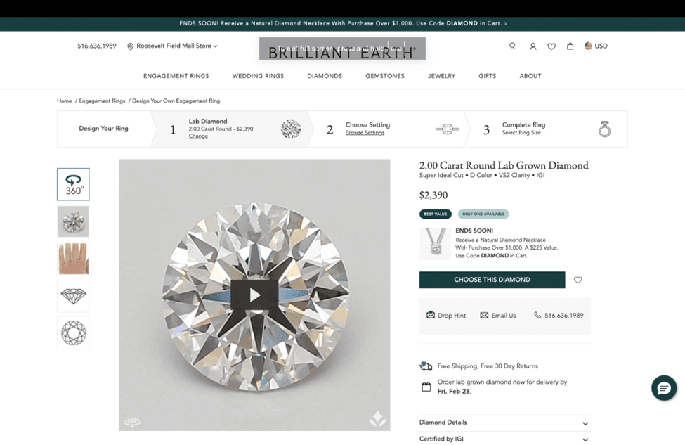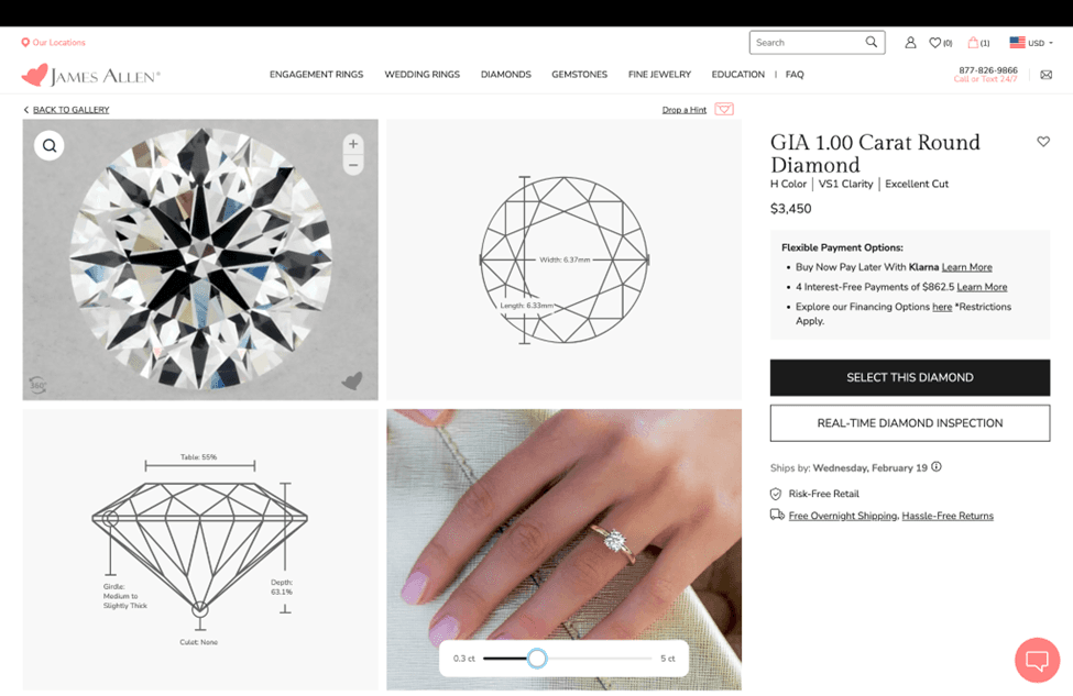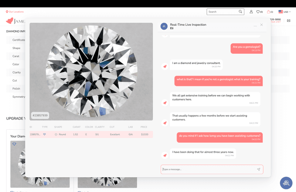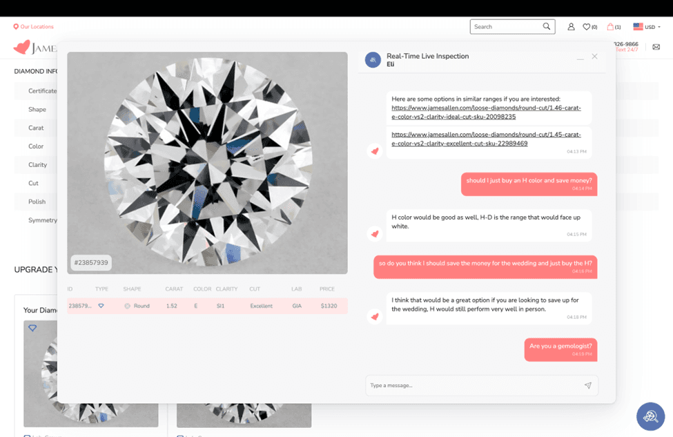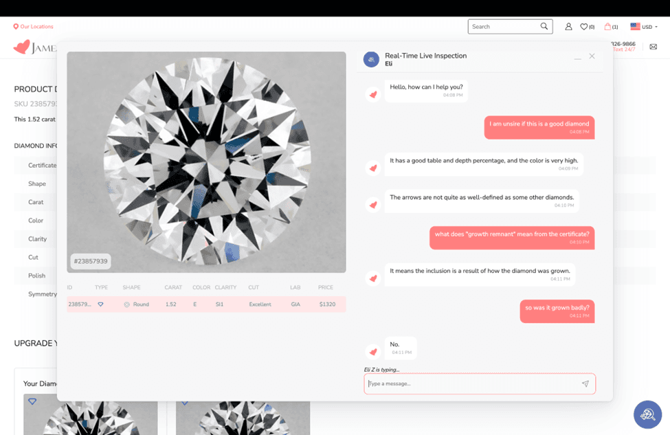 Many first time buyers may not understand how to evaluate a diamond. James Allen offers a real time diamond inspection service where an expert–and not a salesperson on a commission– will share a screen and teach customers everything, one diamond at a time. JamesAllen customer service professionals are essentially a free diamond education resource. They will also aid customers in deciding between a lab grown diamond or a natural diamond.