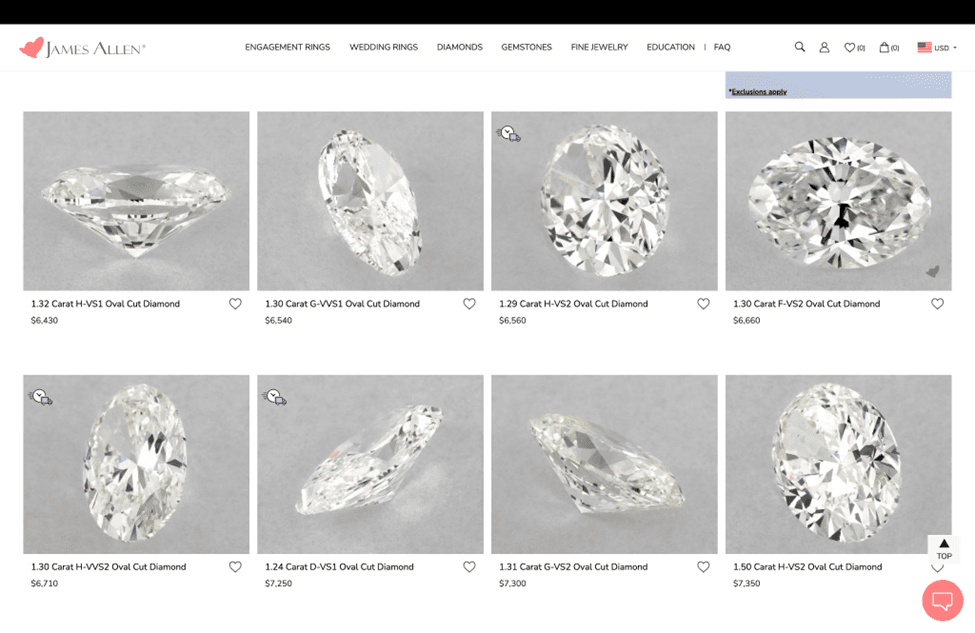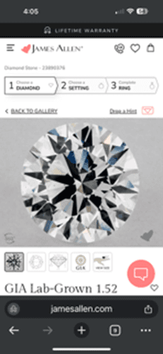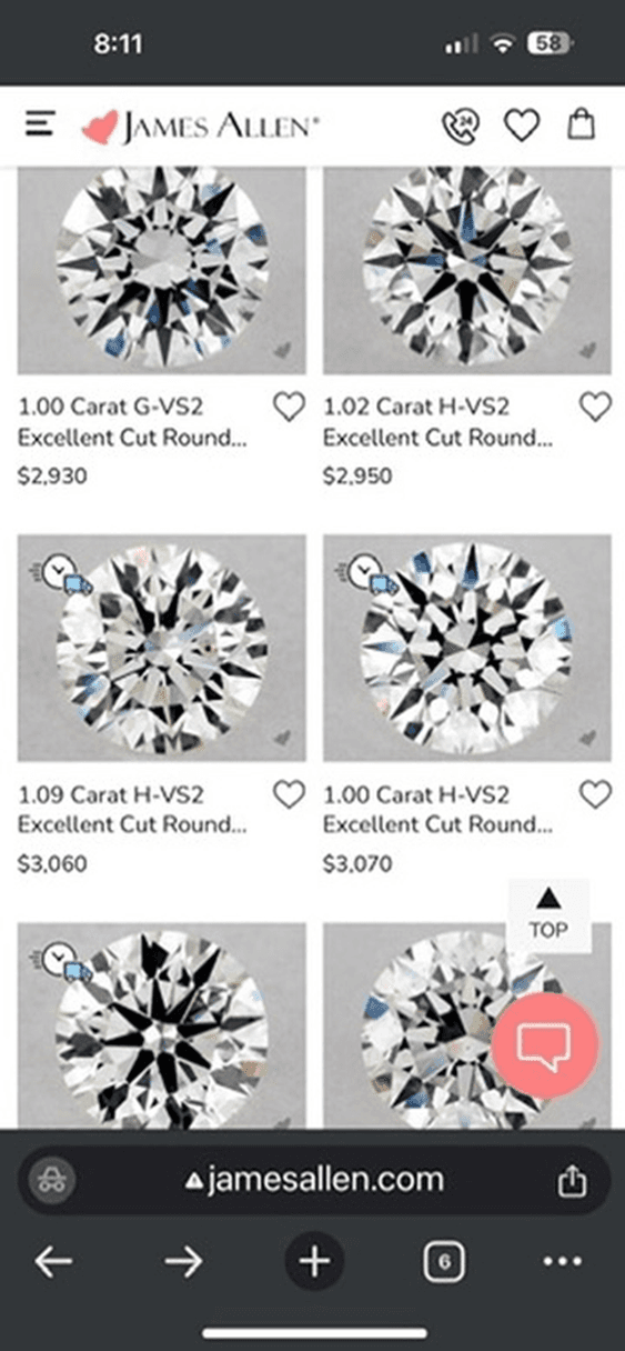 This technology not only enhances the buyer’s confidence by allowing a detailed inspection of the diamond’s facets, but it also reduces the risk of misrepresentation, a common concern in online purchases. We like that James Allen shows actual diamonds when you search their website and not just lists with stock or still images because it makes it so easy to compare many different diamonds. In our test we were able to compare six certified diamonds simultaneously on an iPhone.