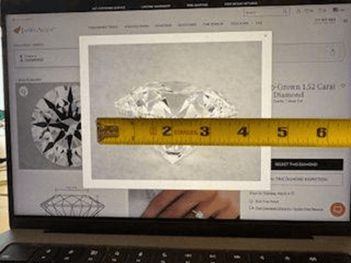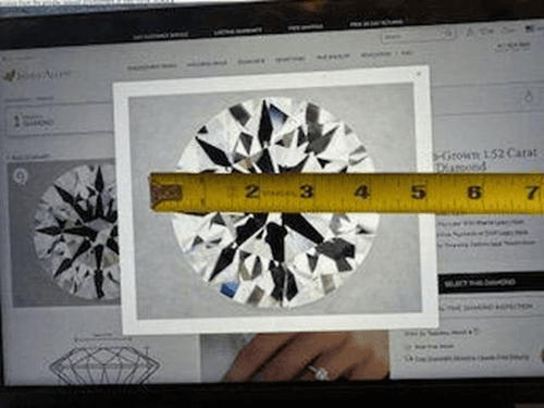 The diameter of the diamond shown is 7.39mm or less than a ⅓ of one single inch in real life, .29 of an inch, to be exact, but measures nearly 4 inches on my Mac and 2 inches on my iPhone: