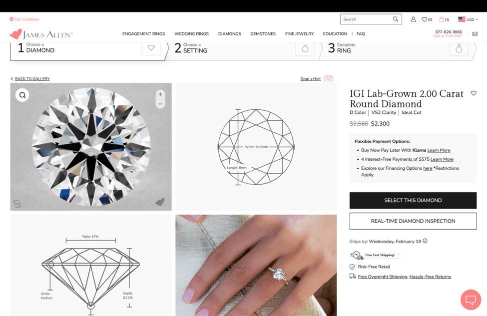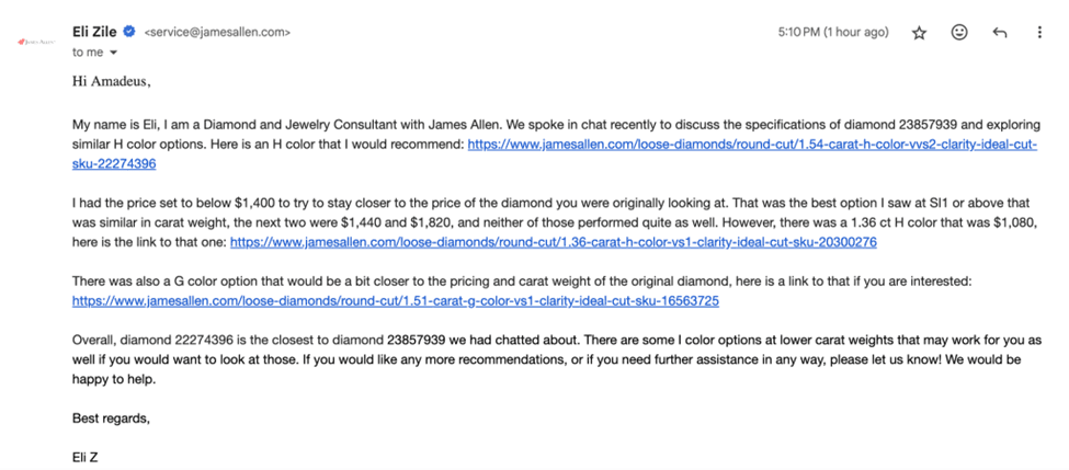 At my request, the James Allen consultant emailed further diamond options, within the hour, one of which was 30% less expensive than the diamond I initially selected: