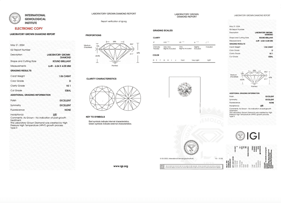 Because of the much lower price of lab grown diamonds JamesAllen uses certificates from the International Gemological Institute, IGI, for the preponderance of their lab grown offering. We agree with this decision because the cost for certification from the IGI is markedly less than the GIA and using GIA could increase the cost of a lab grown diamond by a double digit percentage. Sample IGI certificate from the JamesAllen website: