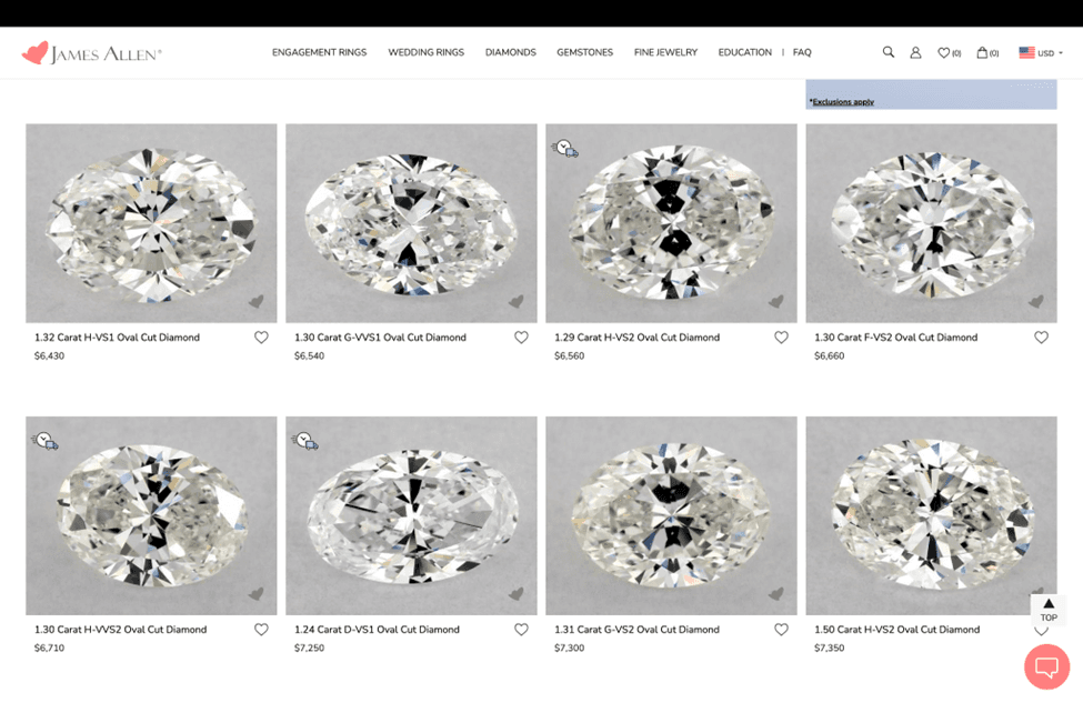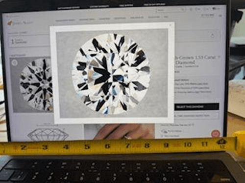 Being able to view the diamond clearly online is of primary importance. The James Allen 360 HD proprietary, online diamond video system is the very best in the world and every diamond is magnified 40x so a shopper can view every imperfection, even those not apparent to the naked eye. James Allen’s 360° HD diamond imaging system is a significant leap beyond the industry norm of 10x magnification. In a store consumers might get to compare a few diamonds. Some jewelers offer a consumer a 10x magnifying glass or loupe, which takes some time to understand how and where to position it, while at the same time handing the buyer a diamond in a special tweezer which also takes time to master. Should a shopper manage a brief view of a diamond this way, they are only able to view one diamond at a time. That is not as useful to a consumer as actually comparing six or eight diamonds side by side.