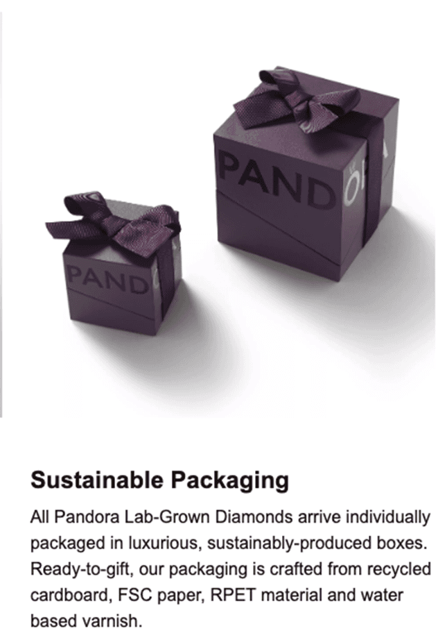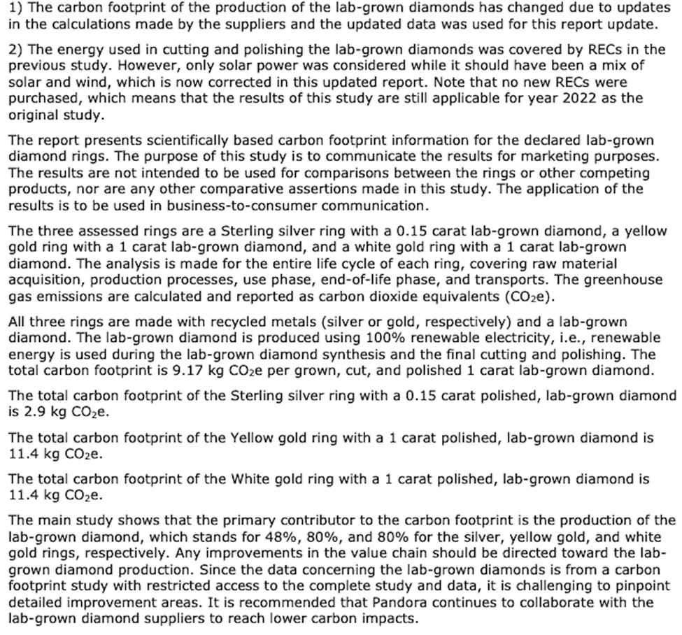 Pandora’s Supplier Code of Conduct is a remarkable 26 page document that stands out for its humanity and requirement for third party audit of any claims made by a supplier. There are detailed and specific pages on their website explaining how Pandora lab grown diamonds have a carbon footprint that is only 5% of the carbon footprint of traditionally mined and polished natural diamonds. There is yet another 29 page document that specifically addresses the testing and methodology to achieve this remarkable number. Here is a critical excerpt relating to the carbon footprint of Pandora’s diamond engagement rings: