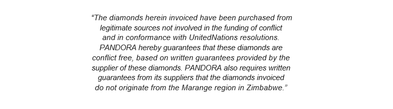 Pandora has historically limited the placement of mined diamonds in its jewelry designs. Part of this may be attributed to the brand’s longstanding commitment to sustainability. Throughout its history Pandora has enforced their own Responsible Supplier Program to prevent the use of conflict diamonds in their jewelry. In their first Ethics report as far back as 2013 they required all their mined diamond suppliers to print the following on every invoice: